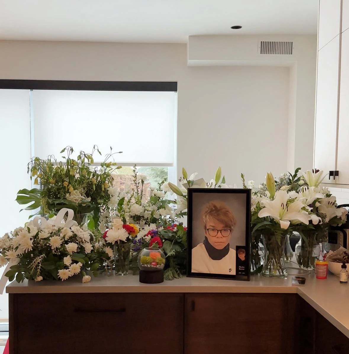 Sur le comptoir en céramique de la cuisine, plusieurs bouquets de fleurs ramenés du salon funéraire embaument la pièce.