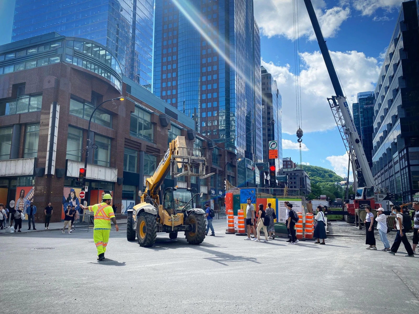 Un peu moins quand un ouvrier de la construction gère le trafic pour faire passer un estifi de gros camion à travers le flot de piéton.ne.s.
