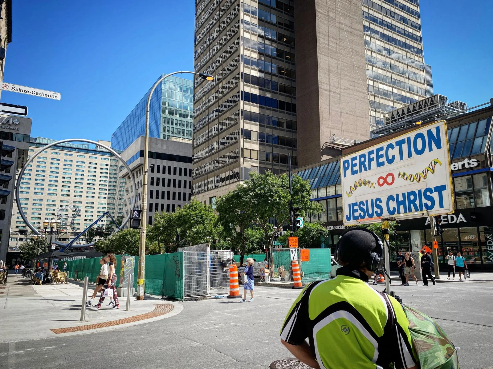 Sur le trottoir au coin de la rue, un gros fan de Jésus nous rappelle que le fils de Marie et Joseph est aussi éternel que parfait. J’ai pensé lui demander son avis sur l’anneau, mais j’ai eu peur de recevoir plutôt son input sur le droit à l’avortement.