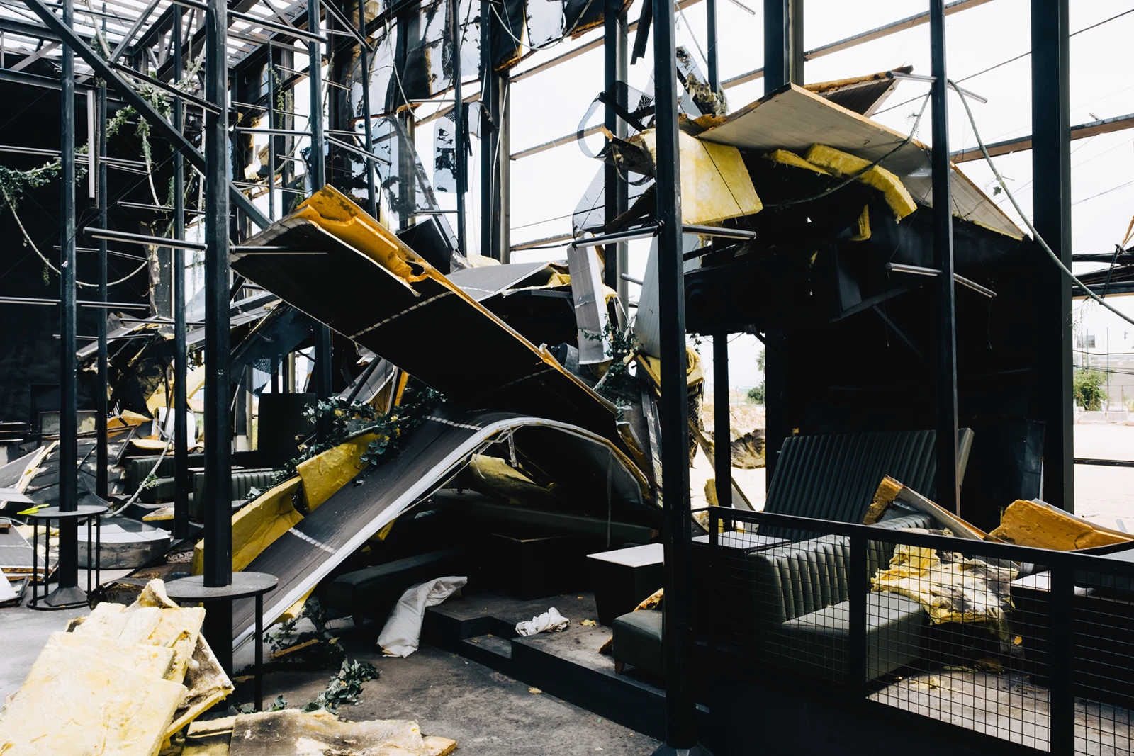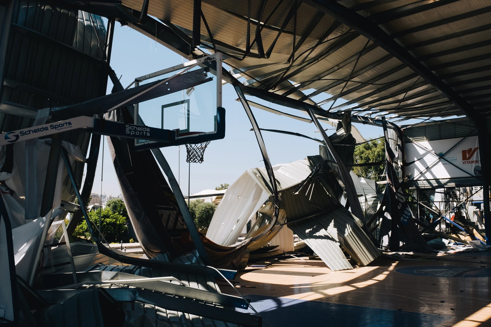 Le souffle de l’explosion a replié les structures métalliques des bâtiments sur elles-mêmes. Ce terrain de basketball en est un exemple.