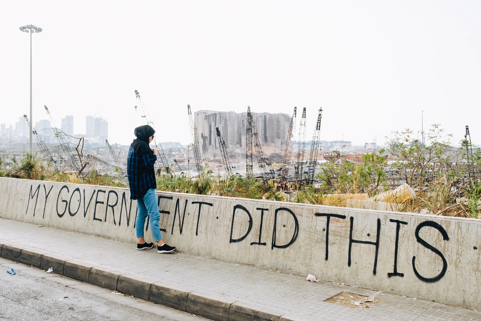 Un graffiti «Mon gouvernement a fait ceci» a rapidement été peint sur le trottoir donnant vue sur le port, référant à la négligence du gouvernement dans la gestion des matières dangereuses.