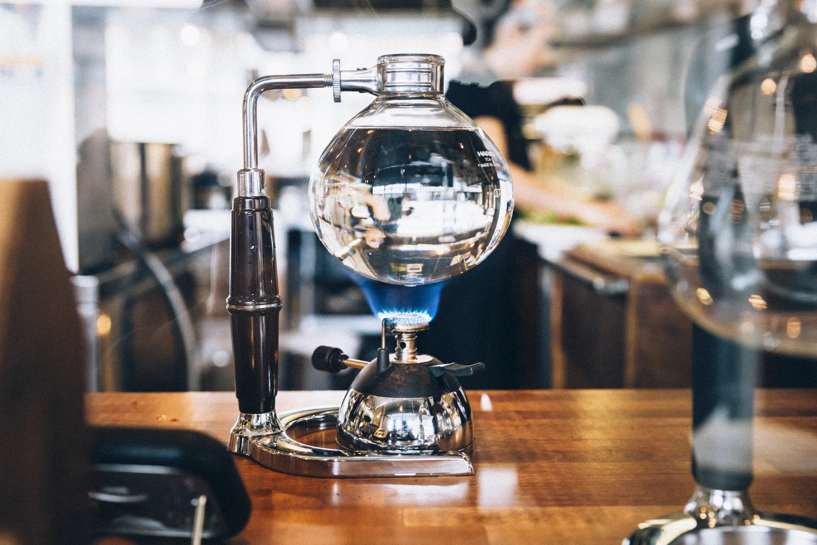 *Cafetière de verre composée de deux ballons reliés par un tube fermé d’un filtre, dans laquelle l’eau du ballon inférieur, chauffée par un brûleur, monte sous pression dans le tube central vers le ballon supérieur contenant la mouture, ce qui permet l’infusion du café, qui redescend ensuite dans le ballon verseur inférieur sous l’effet d’une décompression. -OQLF.