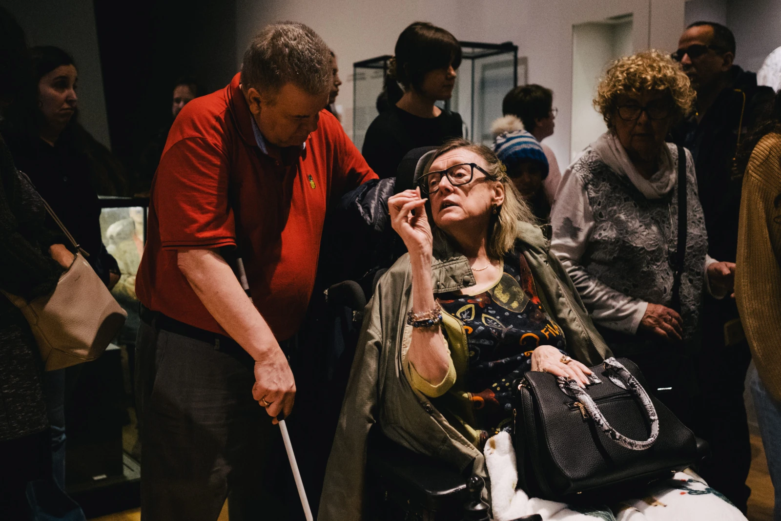 En hiver, le transport adapté lui permet de profiter d’activités intérieures comme la visite du Musée des beaux-arts de Montréal avec sa compagne Francine, atteinte de myopathie mitochondriale. Ensemble, ils forment une équipe: Serge s’appuie sur le fauteuil roulant de Francine pendant que cette dernière mène le convoi. Francine lit les descriptions des œuvres à Serge, qui écoute attentivement.