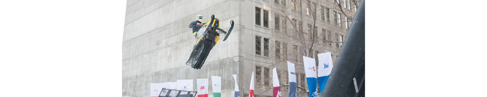 Imaginez maintenant si le temps d’une fin de semaine, le Montréal carte postale prenait forme et que des motoneiges vrombissaient au cœur même du centre-ville. Oui, oui, pour le 375e, Montréal honore à sa façon l’inventeur québécois du motoneige, Joseph-Armand Bombardier, en organisant un spectacle très aérien mettant en vedette dix pilotes casse-cou, présenté par La Tribu.