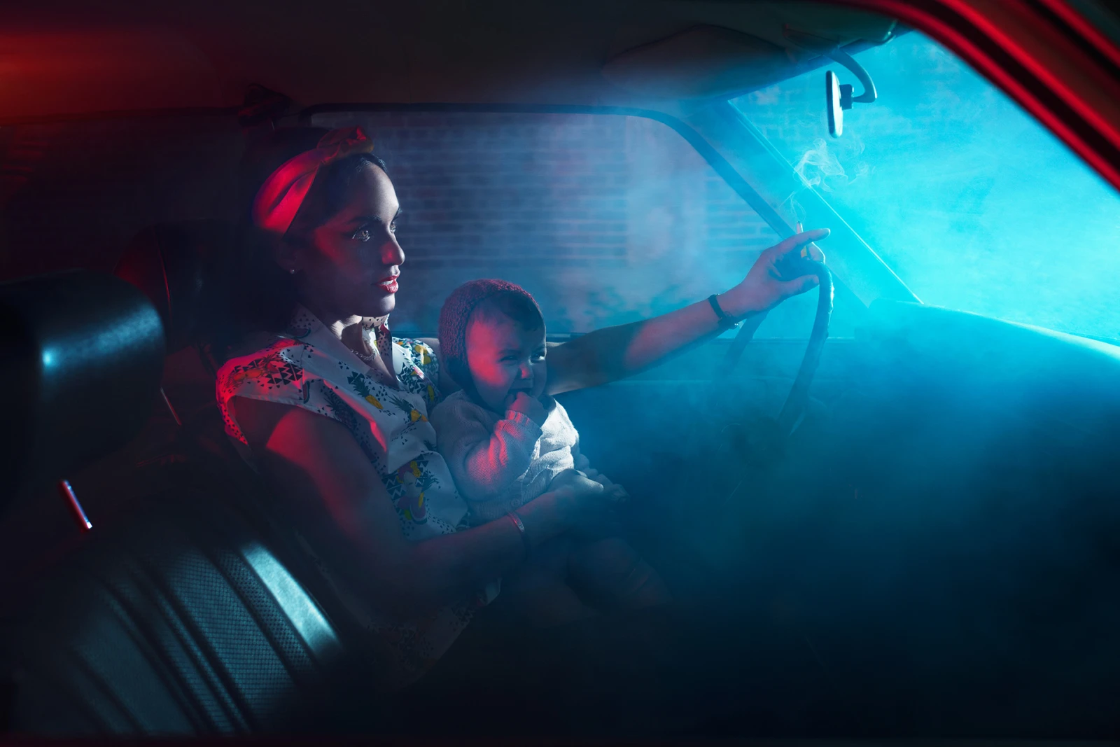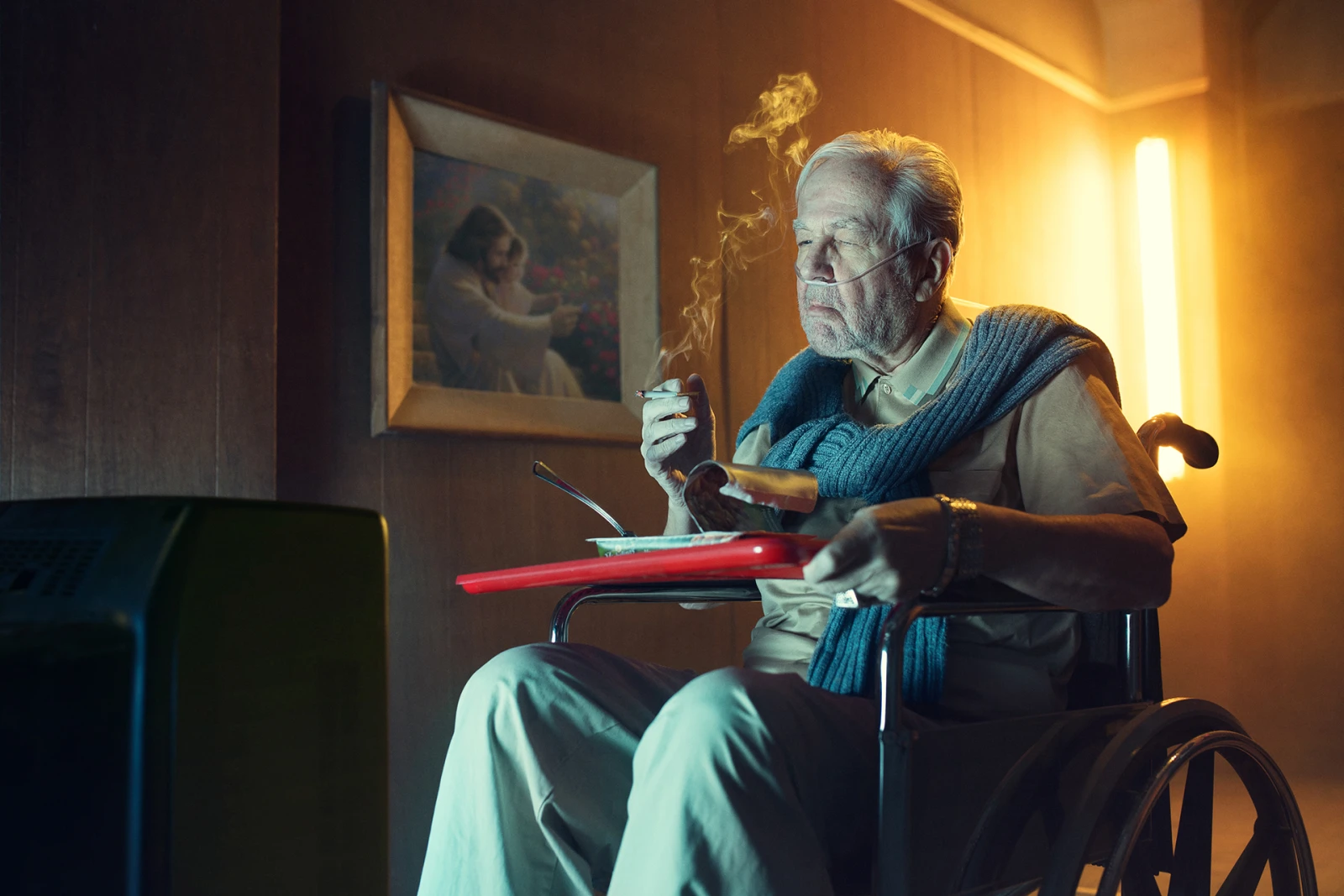 Dans les films, et les séries télés, comme Mad Men, par exemple, le personnage avec une clope parait toujours cool. C’est gracieux, mystérieux et la fumée est un élément intéressant. On sait tous que c’est néfaste pour la santé, mais plein de gens fument quand même. Pourtant dans la «vraie » vie, lorsque tu passes dans la boucane de quelqu’un, c’est dégueulasse. Ce n’est pas cool du tout au fond ! Alors, je voulais mélanger ces deux contrastes en présentant des personnages super caricaturaux; la serveuse, le concierge, l’homme âgé avec des tubes dans le nez mangeant son « Michelinas»… puis la fumeuse avec son bébé dans le char.