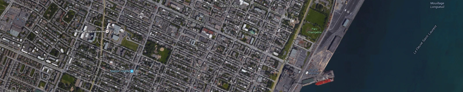 La ligne à droite, c’est la track de chemin de fer, un peu passé la rue Viau. De l’autre bord de ça, y’a le Lafleur, un Tim Hortons, pis des shops. Mais je pense pas qu’il y a personne qui habite de l’autre bord de c’te track de chemin de fer-là…