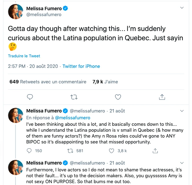 « Les rôles d’Amy et Rosa auraient pu aller à n’importe quelle actrice de la BIPOC (black, indigenous, people of color). C’est décevant d’avoir raté cette opportunité », a notamment tweeté Melissa Fumero, précisant que ses flèches ne sont pas dirigées vers les comédiennes québécoises choisies dans la version québécoise (Mylène Mackay et Bianca Gervais) mais plutôt vers les créateurs de l’adaptation.