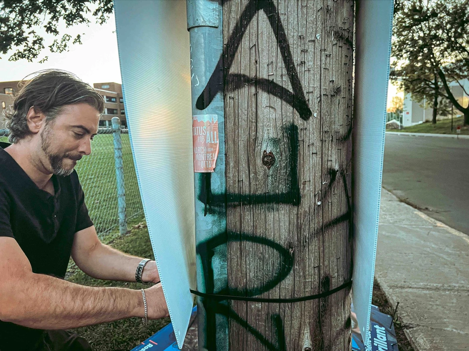 Le soleil se couche et on affiche encore et toujours, infatigables. J’éclaire au cellulaire les minutieux travaux tandis que des marcheurs d’après-souper nous encouragent dans notre besogne.