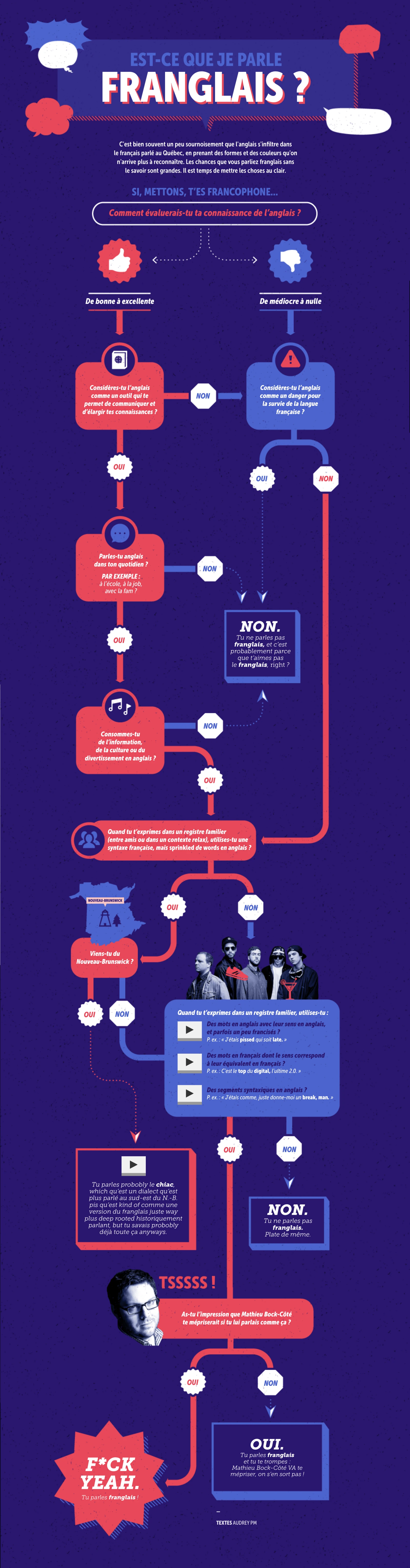 C’est bien souvent un peu sournoisement que l’anglais s’infiltre dans le français parlé au Québec, en prenant des formes et des couleurs qu’on n’arrive plus à reconnaître. Les chances que vous parliez franglais sans le savoir sont grandes. Il est temps de mettre les choses au clair.
