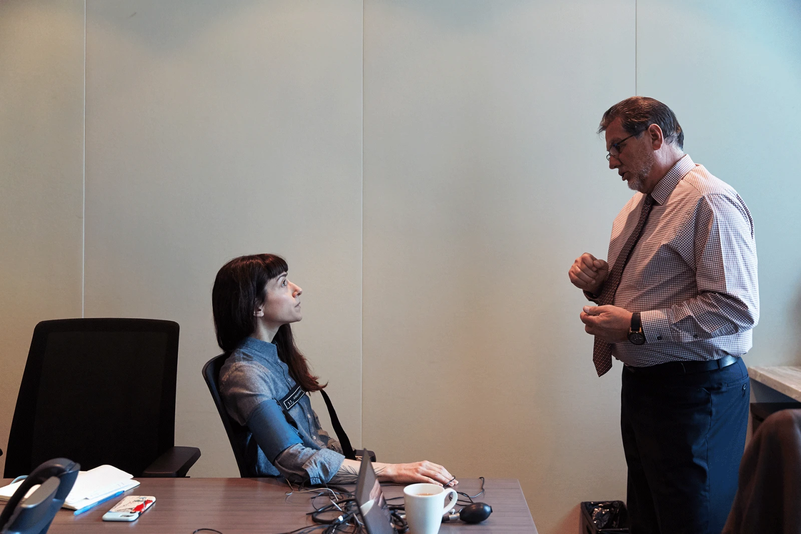 Le « matériel », c’est d’abord… un ordinateur portable. « J’espère que tu n’es pas déçue : c’est “ça”, le polygraphe », me lance-t-il, sourire en coin. Si, pour vous aussi, les mots « détecteur de mensonges » évoquent un instrument vintage avec de grandes aiguilles qui traduisent les réactions physiologiques sur un long rouleau de papier (encore une fois, merci Hollywood !), oubliez ça. Aujourd’hui, les données sont transmises à l’ordinateur et analysées par des logiciels sophistiqués. C’est ce qui donnera les fameux graphiques que Jacques Landry interprétera pour savoir si je mens ou pas. « Mais d’abord, je dois vérifier si tu es apte à passer le test. »