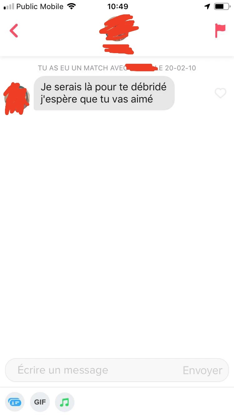 Je tiens tout de même à spécifier que mon expérience sur Tinder n’a pas été complètement de la marde, mais c’est clair que j’aurais pu faire sans ça. Le racisme, même s’il n’est partagé que par une minorité de la population, mérite d’être pointé du doigt. Tsé, me semble que la drague qui n’offense personne c’est pas si compliqué. Des fois, une fille veut juste un gars courtois, civilisé, doté d’un gros bon sens (point boni s’il est capable de conjuguer ses participes passés comme du monde avec l’auxiliaire avoir).