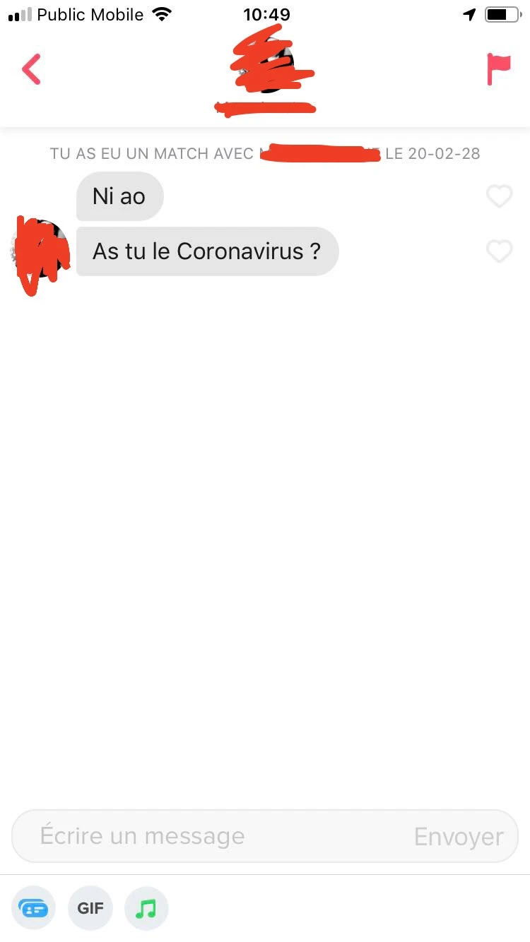 Me faire demander si j'ai le coronavirus, non ça ne me donne pas envie d'aller sur une date.