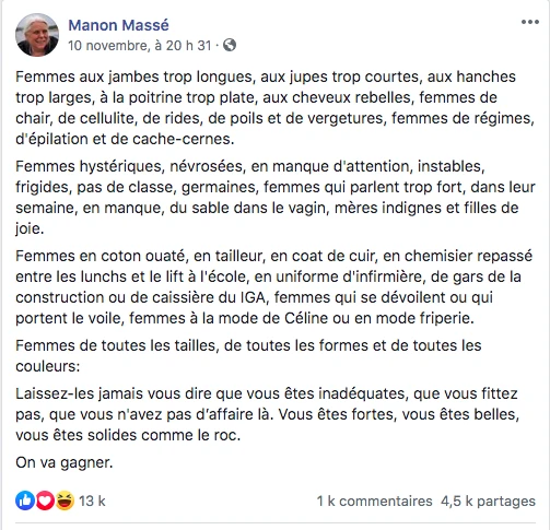 Dans un long texte sur Facebook qu’elle adresse à toutes les femmes qui se font dire quoi faire et comment s’habiller, Manon Massé conclut par un énergique: « On va gagner », comme si les Québécoises venaient d’entrer collectivement en guerre contre les hommes anti-coton ouaté de Catherine.