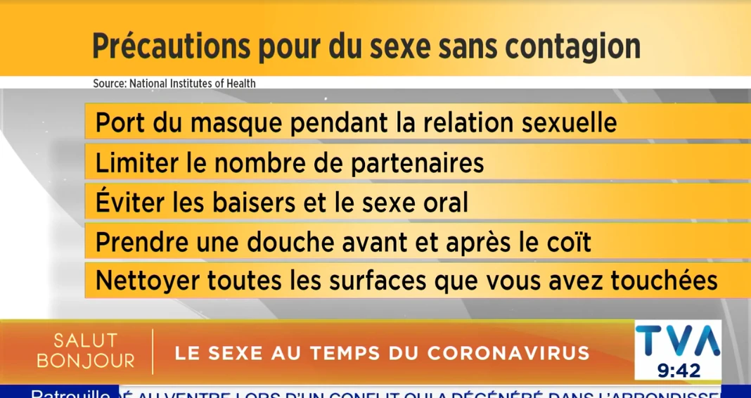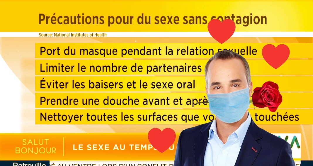 Les chercheurs ont donc émis leurs recommandations, énonçant d’abord les pratiques sexuelles les plus sécuritaires en allant jusqu’à celles ayant un plus fort potentiel de contagion à la COVID-19. Comme en faisait foi cette chronique de Gino Chouinard à Salut Bonjour il y a quelques jours (ça commence à 01:48:00), la liste a de quoi laisser perplexe. L’une des recommandations pour éviter la contagion lors d’un rapport sexuel? Porter un masque pendant l’acte, puisque la distanciation sociale est difficile à respecter lors des ébats.