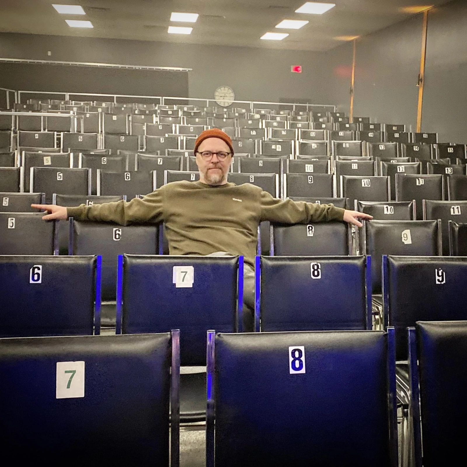 Le premier termine d’installer environ 200 chaises dans la grande salle, l’autre termine de souper dans une pièce au fond servant de loge.