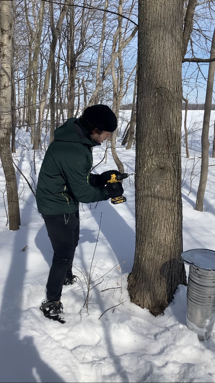 Seuls les érables qui ont un diamètre de 10 pouces et plus peuvent être entaillés. Une fois les meilleurs spécimens trouvés, le jeune homme sort sa perceuse et la colle à un angle d’environ 80 degrés avec l’écorce (et non 90) pour créer un trou en pente descendante. La profondeur de son trou est de 5 cm à 6 cm. Chaque année, le trou doit changer d’endroit sur le tronc afin d’éviter d’endommager l’arbre.