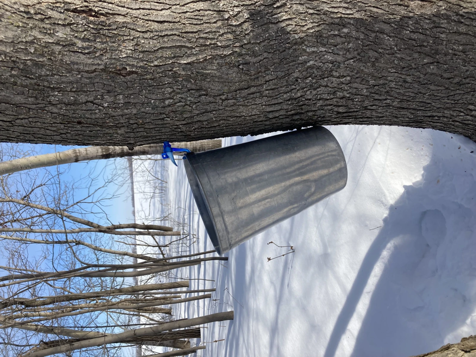 En ce samedi ensoleillé du mois de mars, Guillaume entame l’entaillage de ses arbres. C’est un art de choisir une bonne date. Trop tôt, l’eau d’érable ne coulera pas à pleine capacité, car le trou de l’entaille pourrait avoir le temps de se refermer légèrement. Trop tard, il pourrait manquer quelques jours de bonne production.