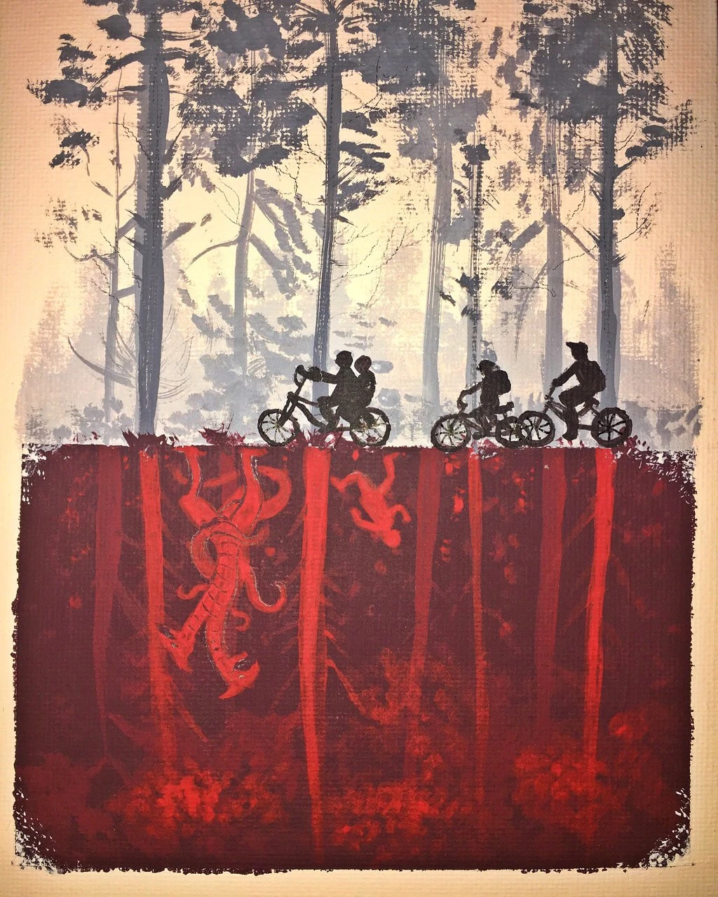 Il existe deux grandes catégories de fan art : le transformatif et l’affirmatif. Le fan art affirmatif reprend les codes du monde fictif sans les changer. Une de ses formes les plus populaires demeure les affiches alternatives, comme celle-ci, réalisée par l’artiste Crimsella pour la télésérie américaine Stranger Things. L’affiche a été publiée sur Deviant Art, une plateforme en ligne qui comte 26 millions de membres et 251 millions d’œuvres, en majorité du fan art.