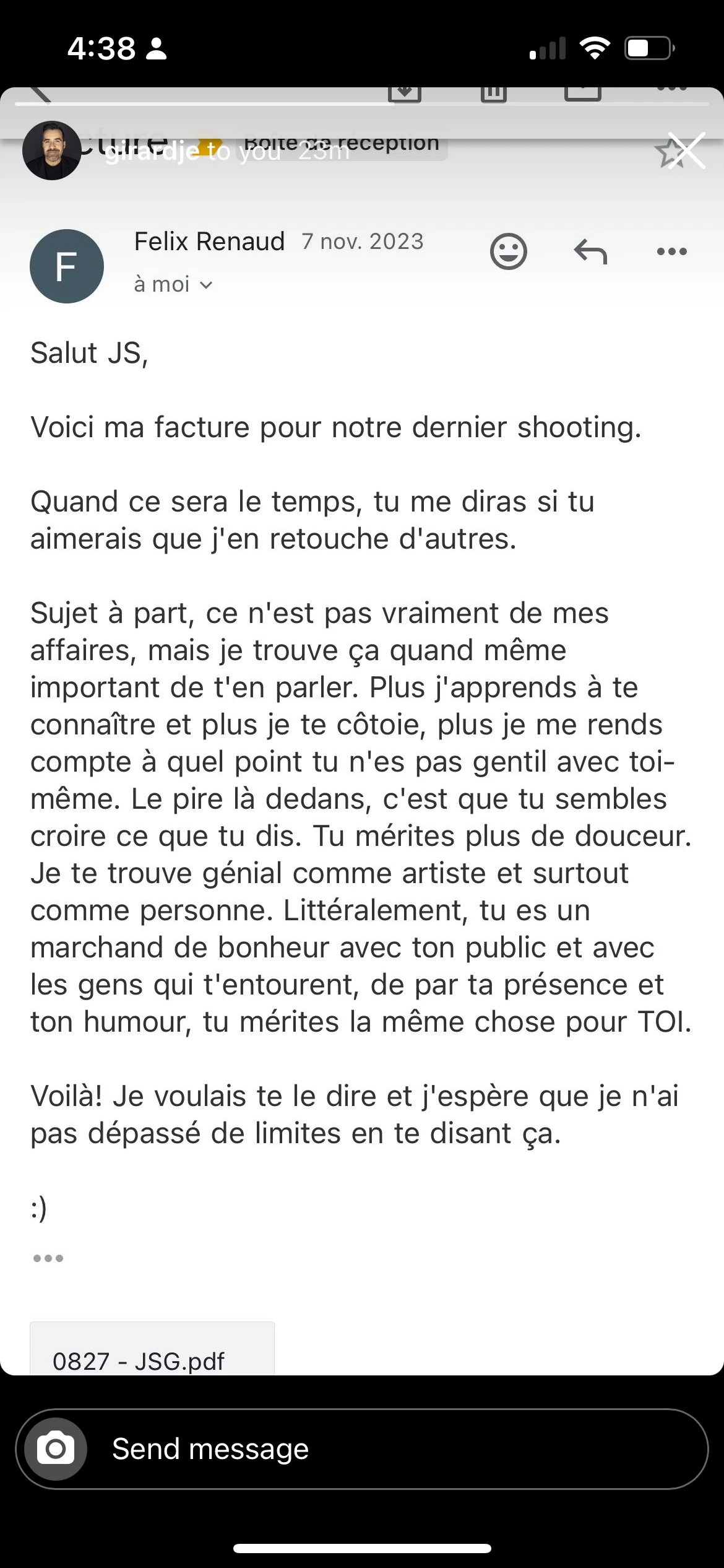 « À notre dernier shooting ensemble, j’avais (comme toujours) des commentaires violents à mon endroit », raconte l’humoriste et animateur Jean-Sébastien Girard, qui faisait affaire avec Félix depuis dix ans. « Du genre : “mon Dieu que je suis gros”, “mon Dieu que j’ai huit mentons”, “mon Dieu que je cale”. Il n’a pas aimé ça et regarde ce qu’il m’a envoyé, par la suite. »