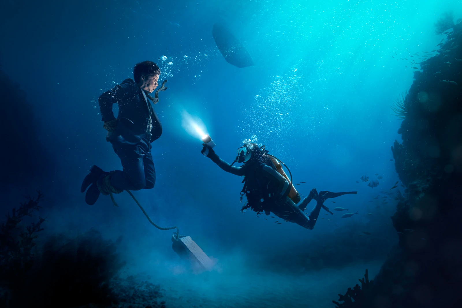 Les notions de sécurité! L’électricité et l’eau font assez mauvais ménage. Demander à un modèle de jouer la comédie, ligoté avec des vêtements dans le fond d’une piscine peut être assez dangereux aussi. C’est pourquoi j’ai fait le choix de faire cette photo avec Gregory Costa, un apnéiste de talent qui peut aisément retenir son souffle pendant plus de 4 minutes. Pour faciliter la chose, nous lui avions mis de la corde autour d’un poignet et d’une cheville seulement, ainsi quand il prenait sa pose, on avait l’impression qu’il était ligoté, mais en réalité il était libre de bouger pour remonter facilement à la surface entre les prises.