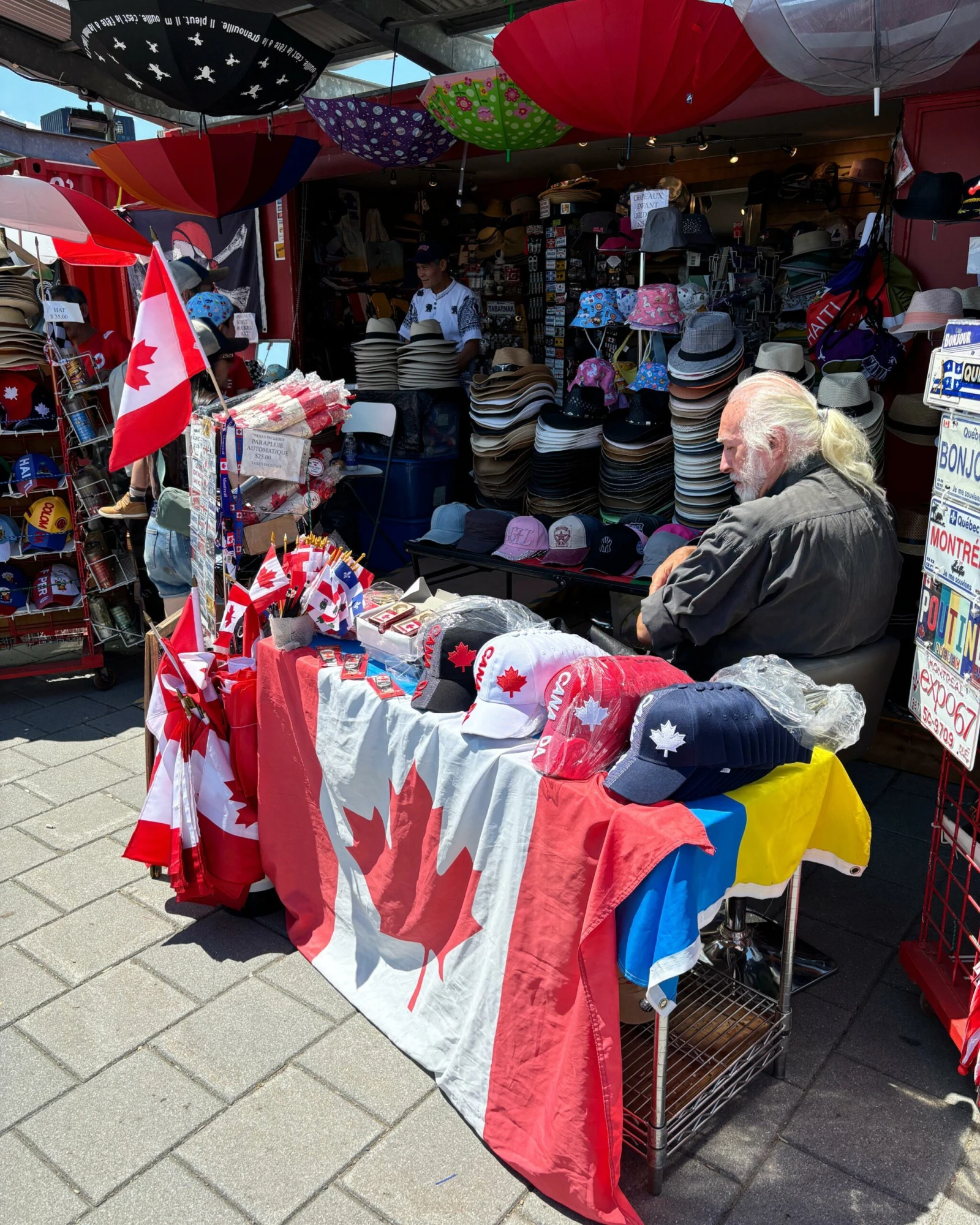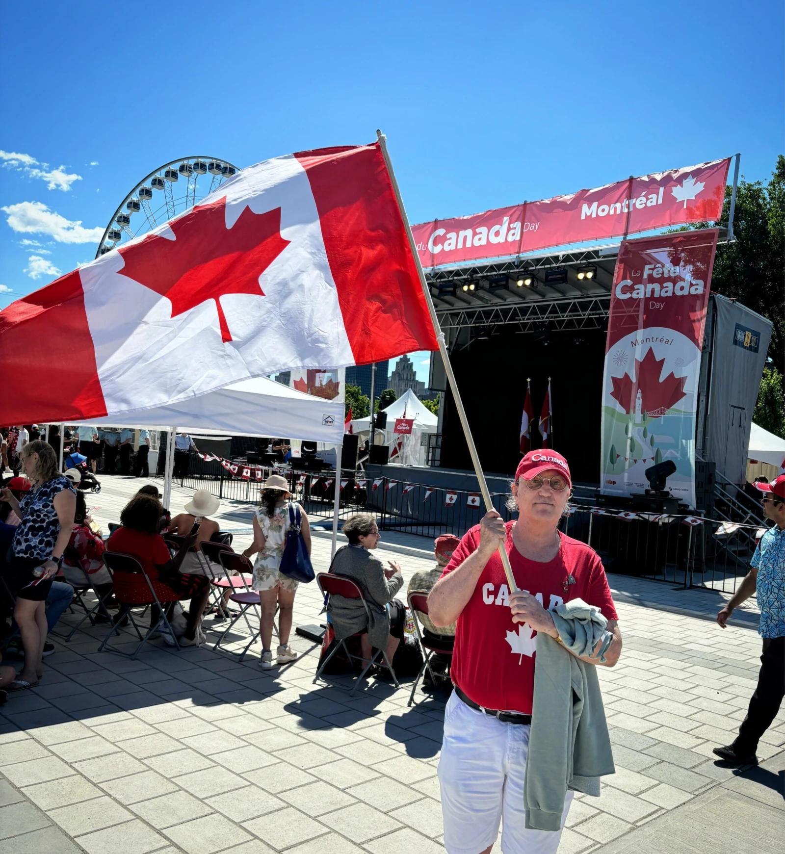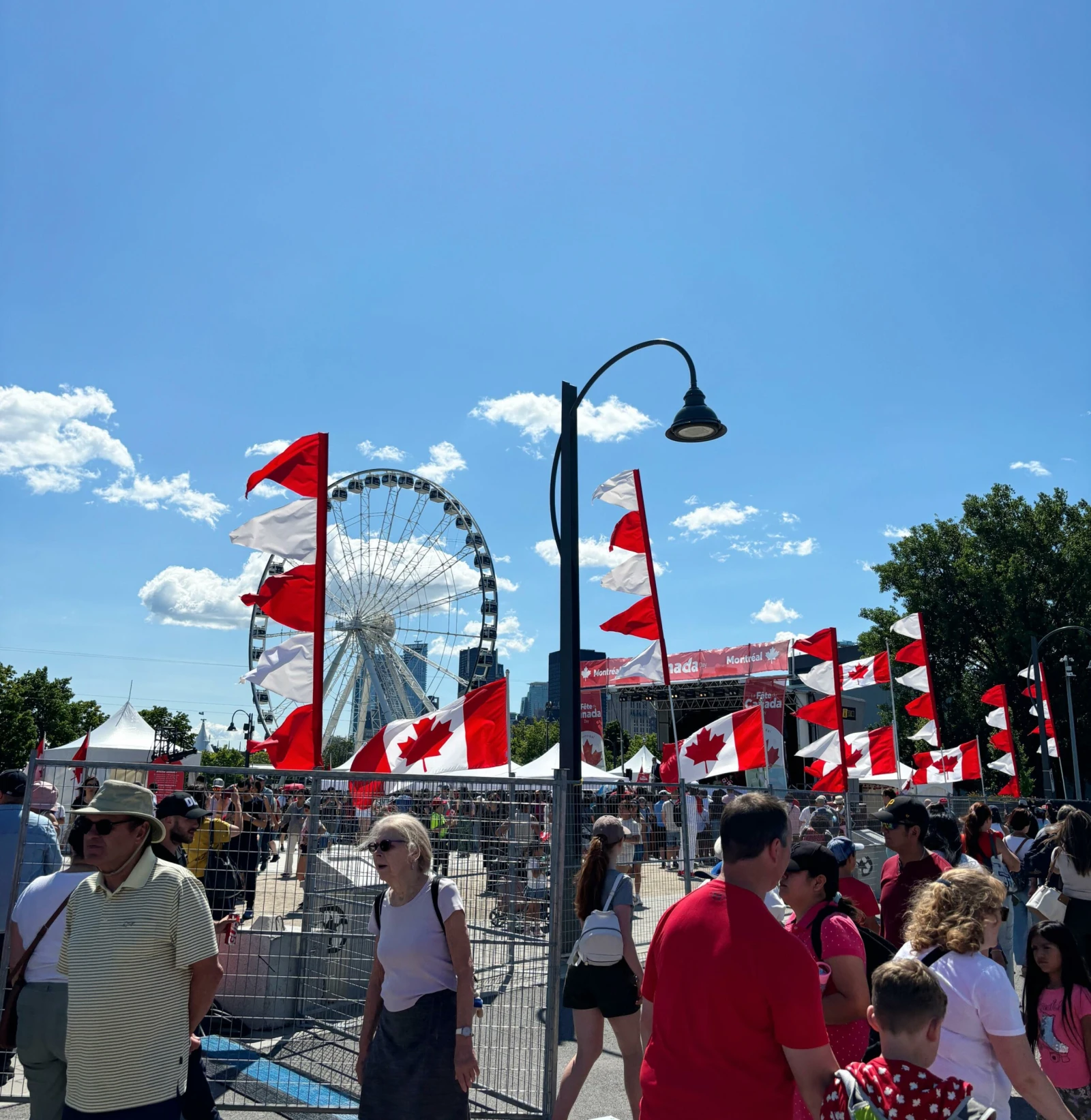Les festivités se déroulent près du Quai de l’Horloge, à l’ombre de la tyrolienne. Il y a du monde partout, le soleil cogne et la grande roue a été décorée avec une feuille d’érable. Les commerçants vendent toutes sortes d’artéfacts canadian, des drapeaux aux casquettes, en passant par les écussons, les pins et les parapluies.