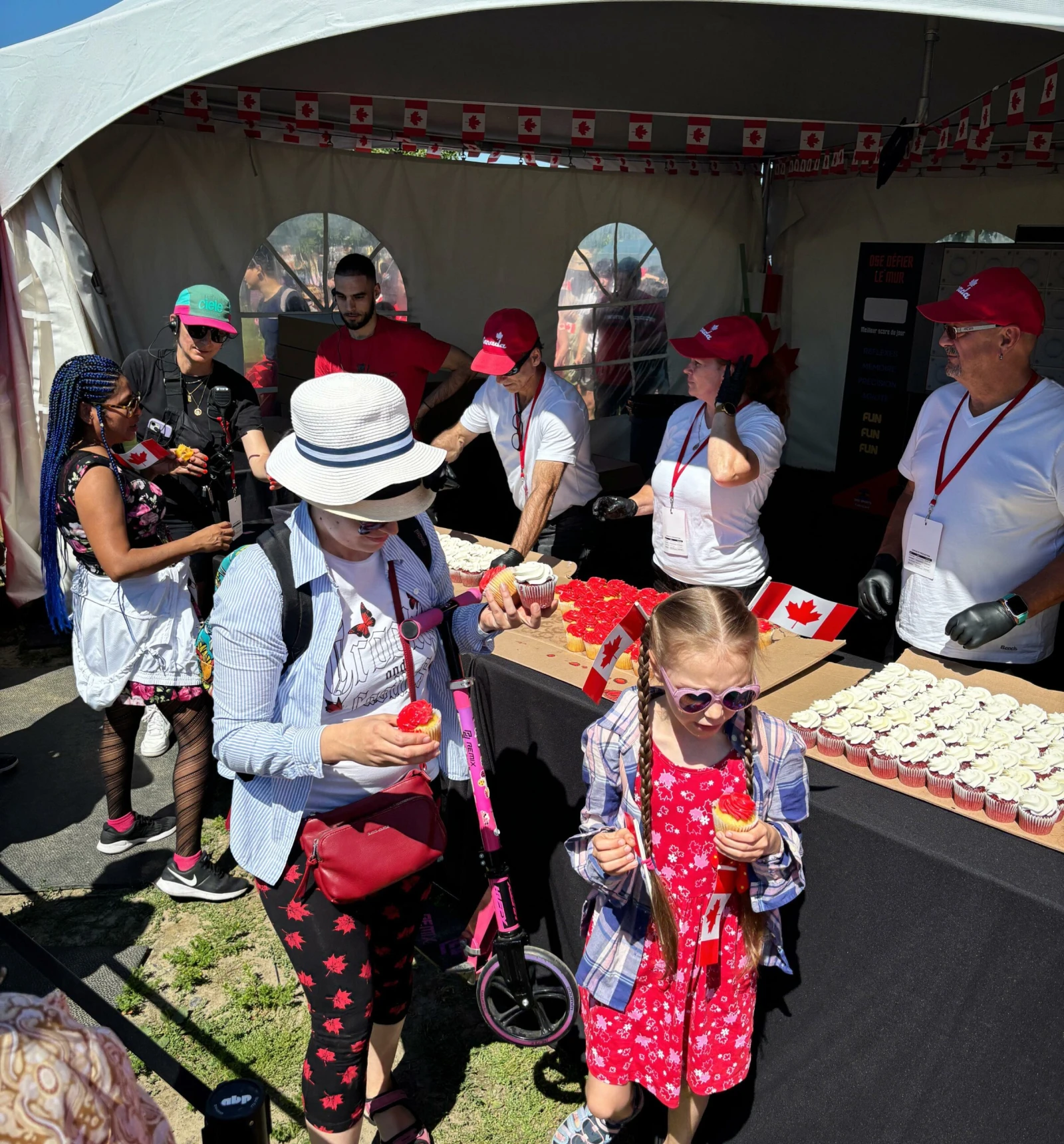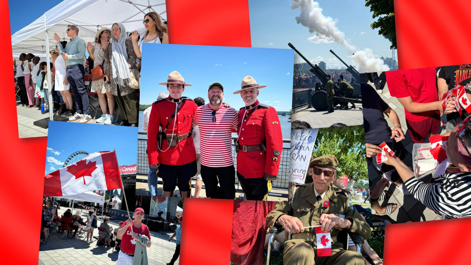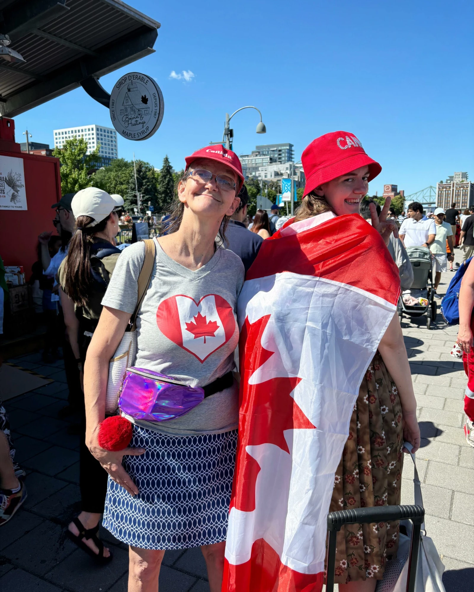 Les festivités se déroulent près du Quai de l’Horloge, à l’ombre de la tyrolienne. Il y a du monde partout, le soleil cogne et la grande roue a été décorée avec une feuille d’érable. Les commerçants vendent toutes sortes d’artéfacts canadian, des drapeaux aux casquettes, en passant par les écussons, les pins et les parapluies.