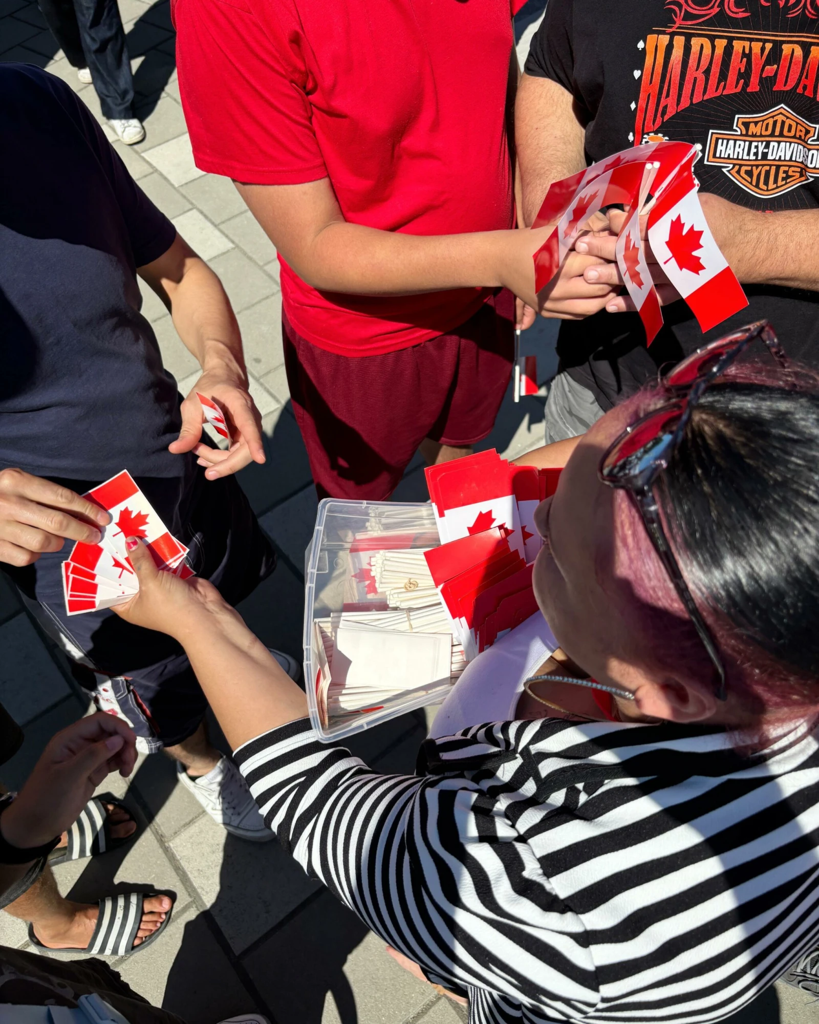 Même frénésie autour d’une madame qui distribue gratuitement des mini drapeaux et collants de l’unifolié. Les gens se les arrachent comme si c’était du papier cul en spécial à la mi-mars 2020.