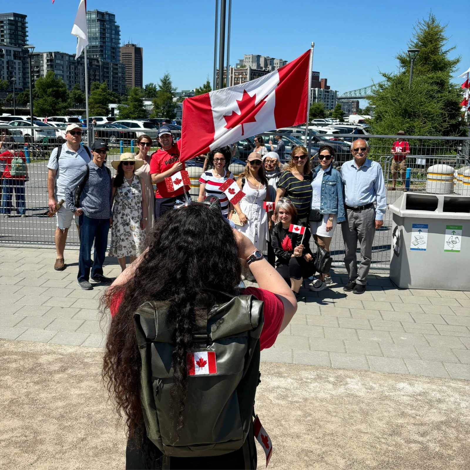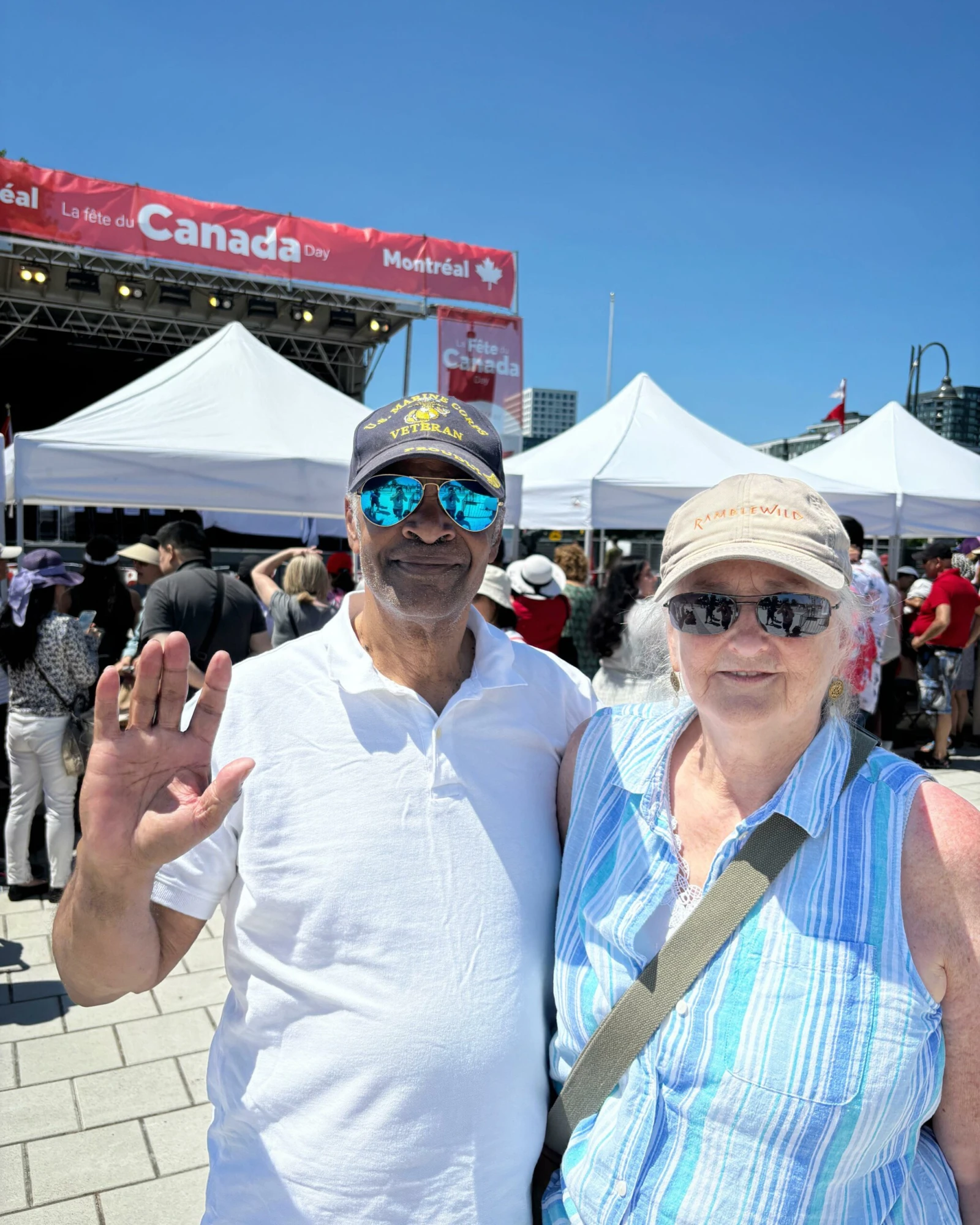 Un animateur invite les gens à s’approcher. Je croise Wellan et Linda, un couple du Massachusetts qui vient depuis douze ans à Montréal pour les vacances à ce temps-ci de l’année, notamment pour profiter du 1er juillet. « On aime comment vous célébrez tout le monde et toutes les cultures. C’est émouvant de voir des gens d’autres pays devenir Canadiens. On a tous les deux des ancêtres du Canada », raconte Wellan, coiffé d’une casquette de vétérans, avec une pointe de jalousie.