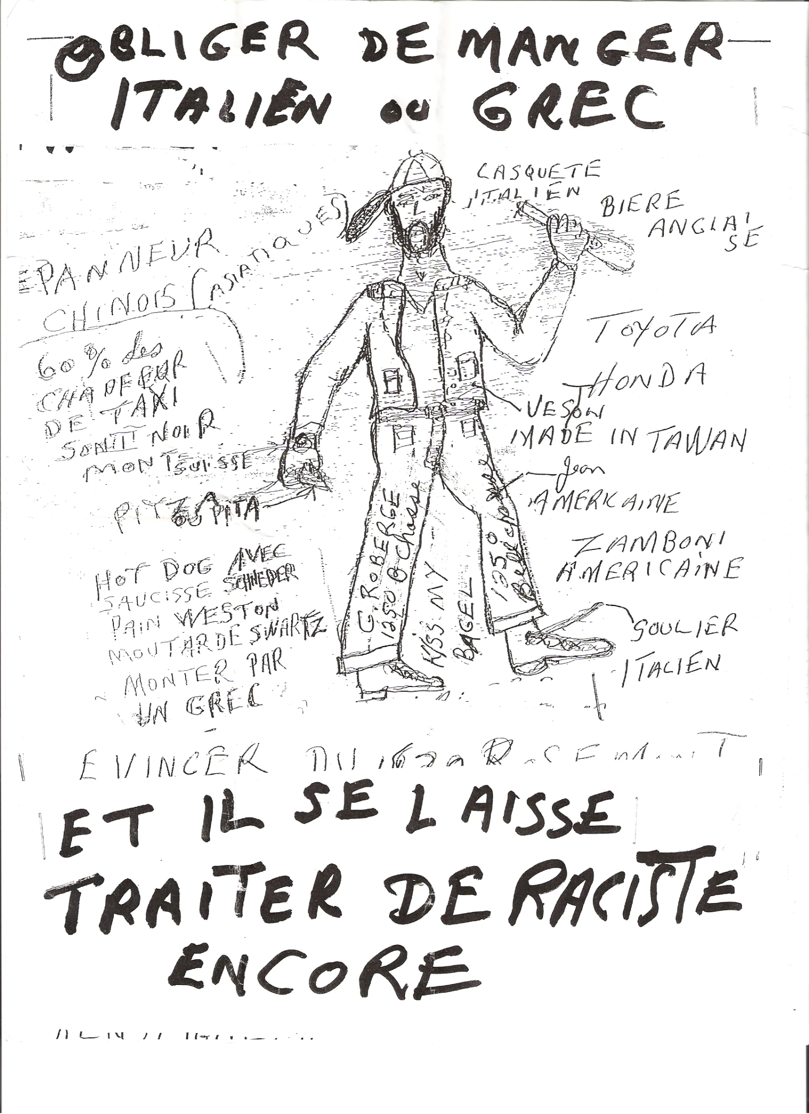 La première fois que j’ai vu l’une d’entre elles, je me suis dit que j’avais probablement affaire à un dingo qui se ferait institutpinelliser rapidement. Or, quelques semaines ont passé, et j’ai trouvé d’autres reproductions de ces pamphlets pour le moins particuliers. On les reconnait facilement: ils sont tout à fait xénophobes, ils sont très artisanaux, ils sont complètement incohérents, chaque pièce est unique et TOUS sont signés G.Roberge, 1250 Bellechasse.