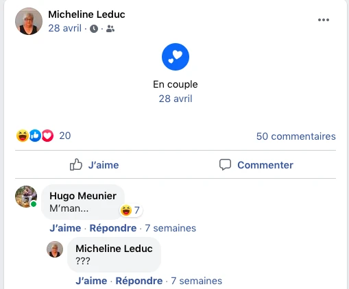 Après de belles années eustachoises et nomininguoises, il habite depuis quinze ans avec ma mère au-dessus de chez nous. Ma génitrice n’est pas moins dévouée, même si elle passe le plus clair de son temps sur Facebook à partager des alertes Amber du Wisconsin datant de 2009 ou des affaires bizarres comme ceci… après 48 ans de mariage.