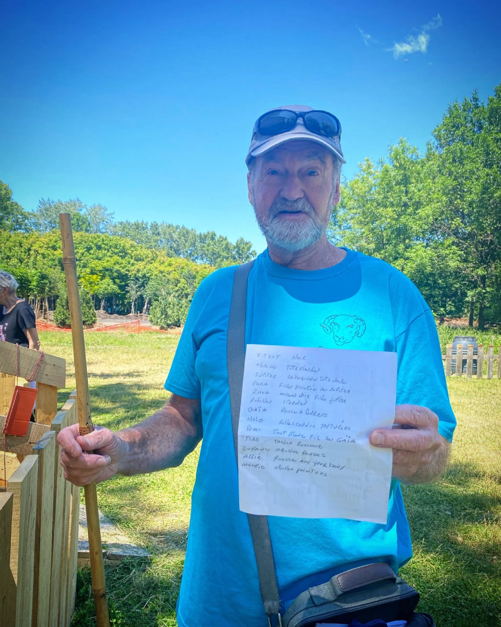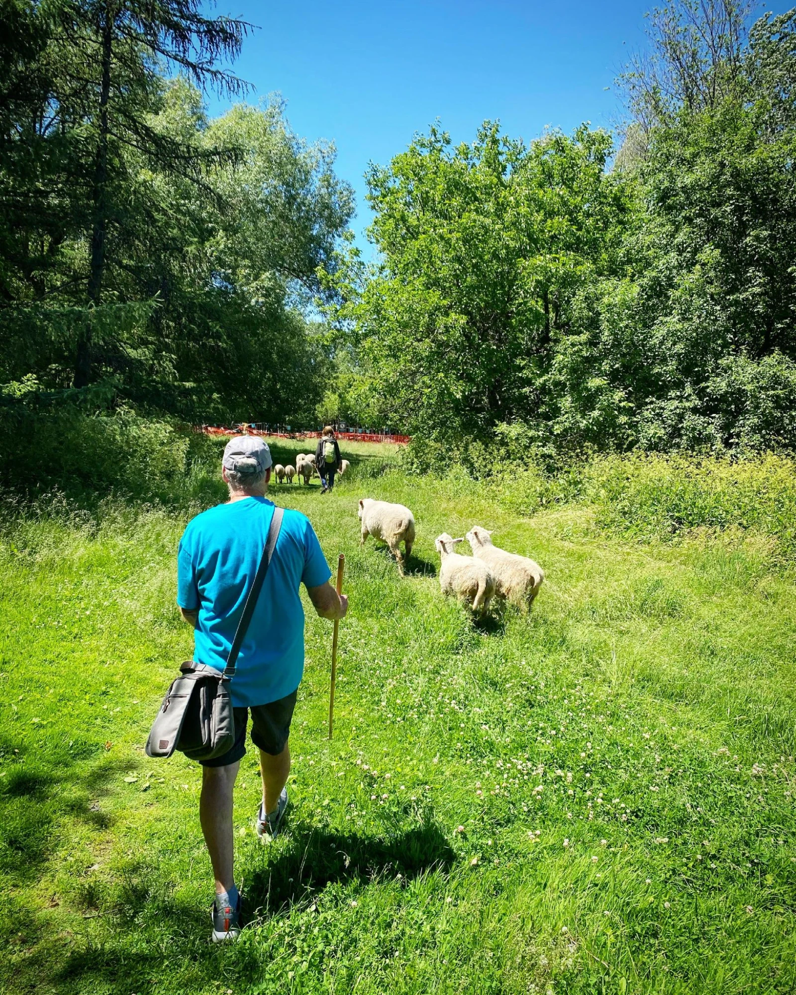 Isabelle a déjà ramassé plusieurs crottes sur le terrain autour avec son sac à lunch, pendant que je m’appuie sur mon bâton (prêté) pour avoir l’air d’un berger convaincant.