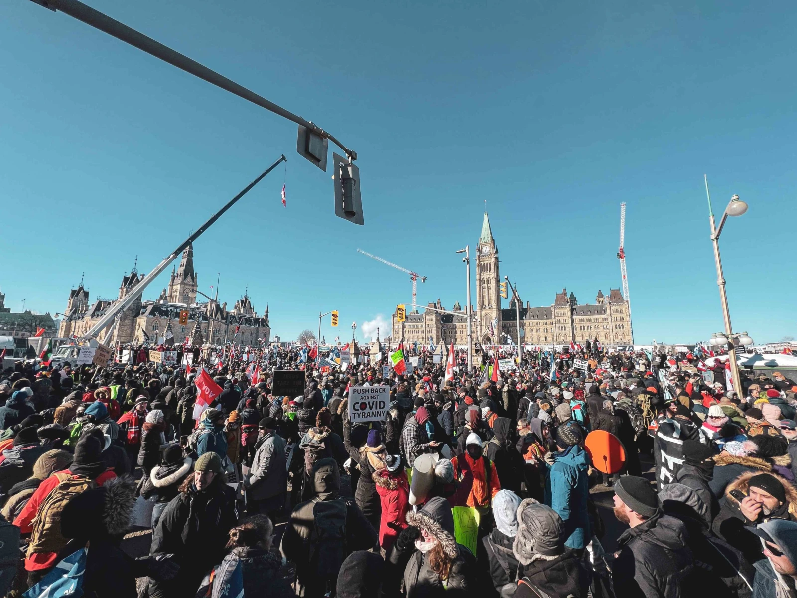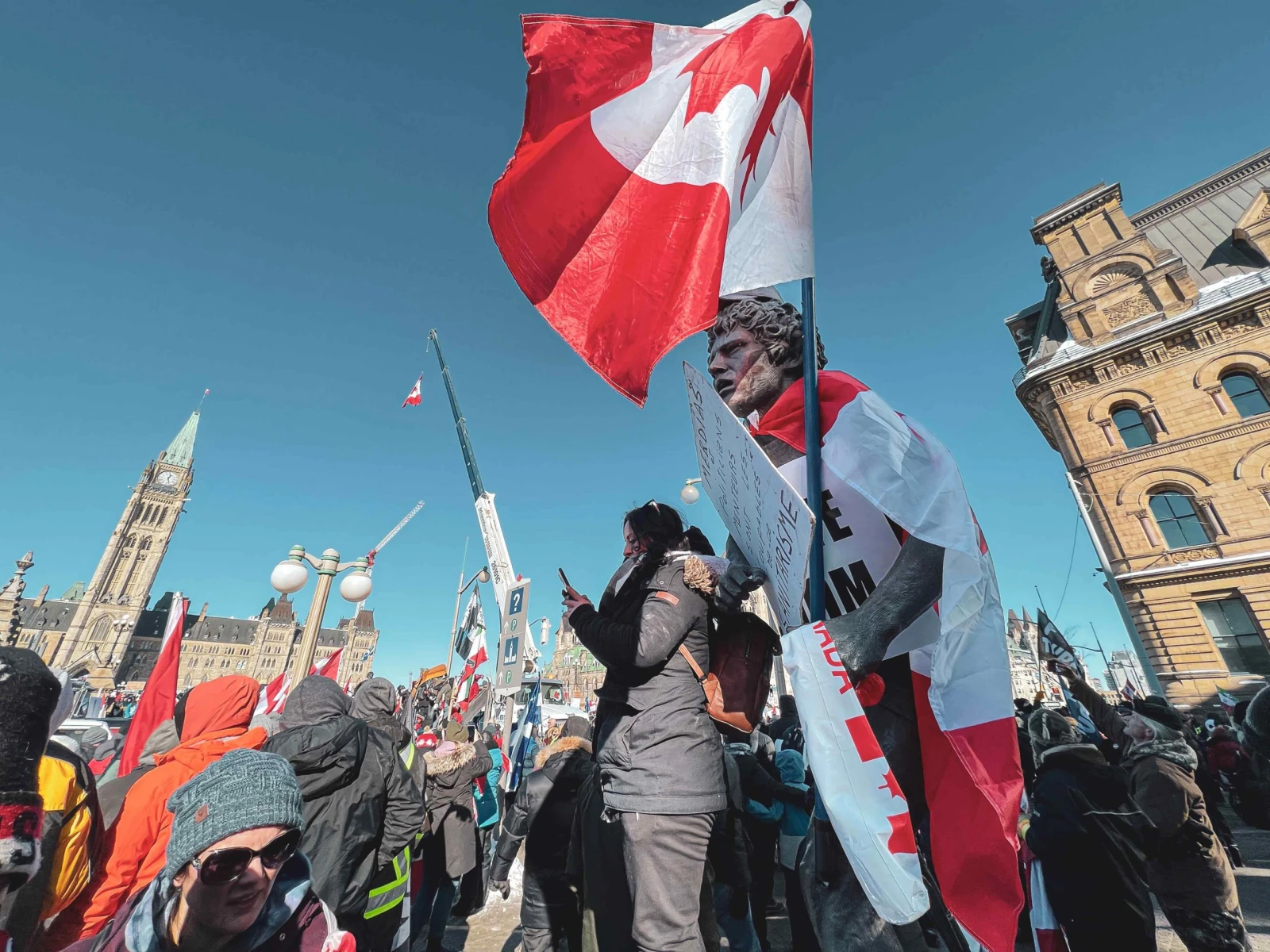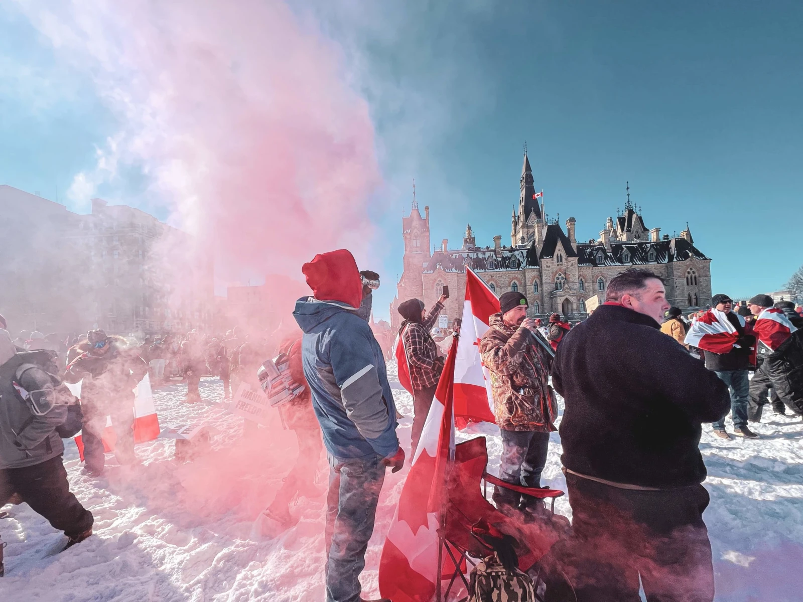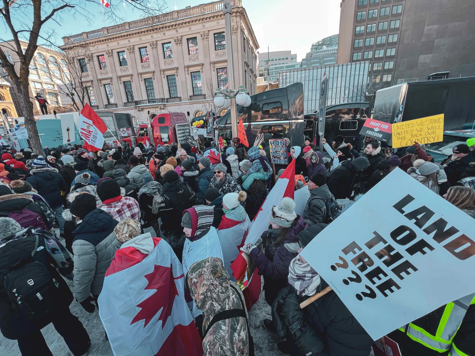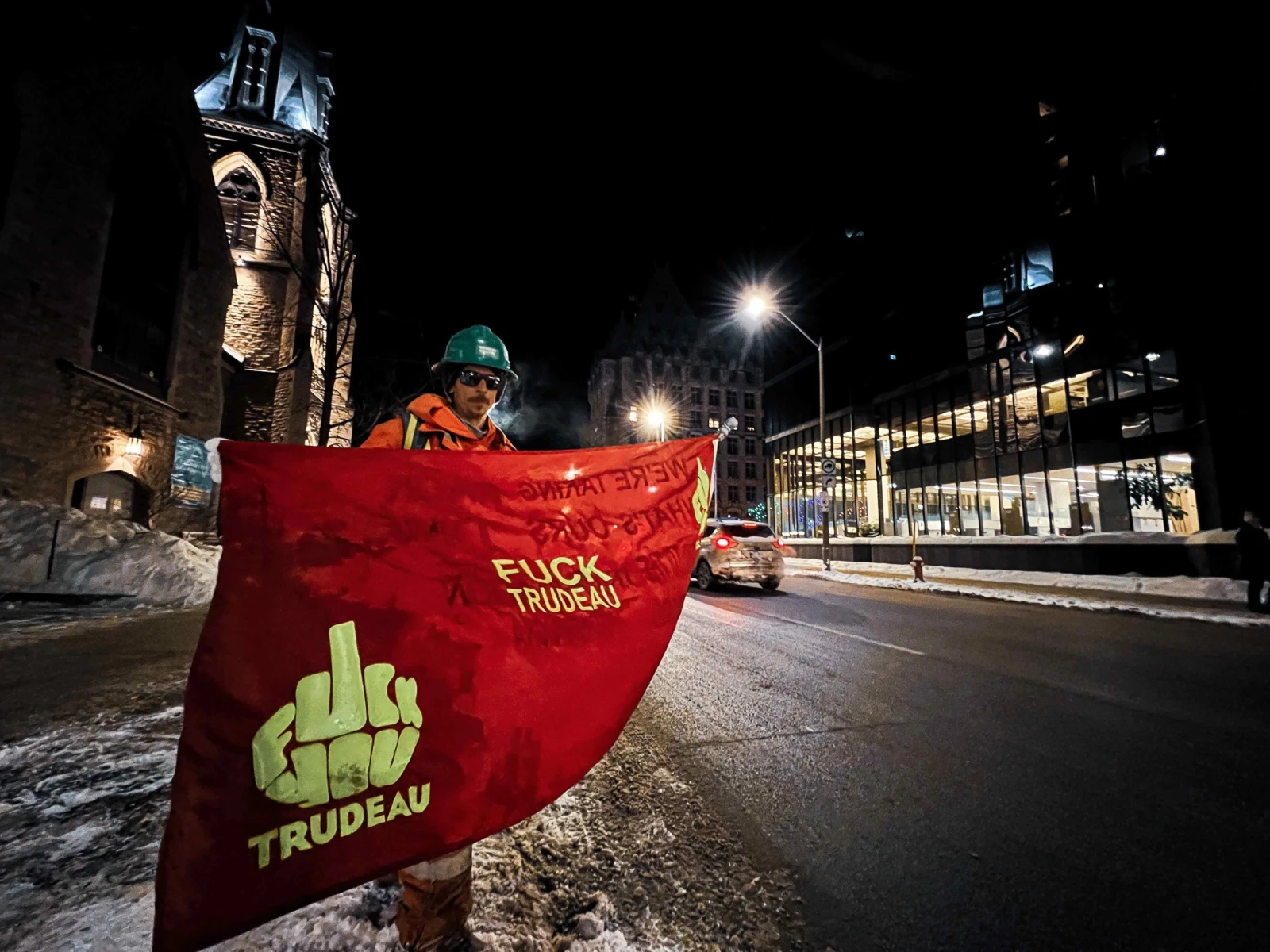 Je stationne péniblement ma voiture dans le Vieux-Hull pour rejoindre une longue file de marcheurs et marcheuses en direction du Parlement. Des familles entières sont drapées dans l’unifolié, d’autres arborent des habits de motoneige. Il résonne du cordon des « Olé » typiques du Canadiens de Montréal et des « We love truckers » qui répondent à des cris plus folkloriques : « Les Québécois sont là, tabarnak! » La table est mise.