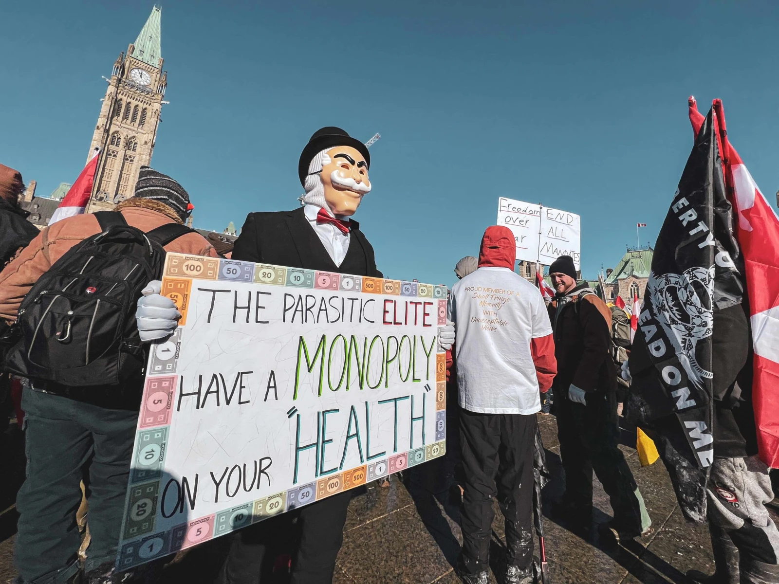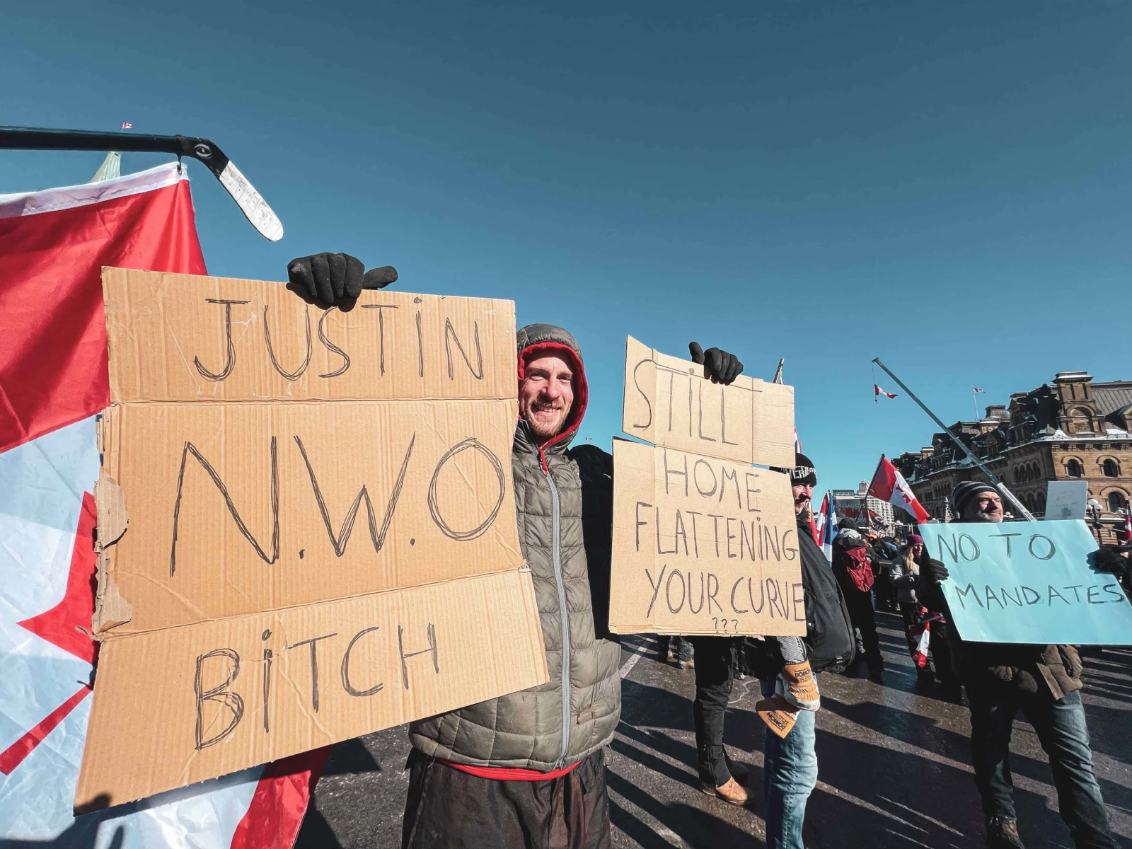 À lire quelques-unes des milliers d’affiches présentes, il est question du libre choix, de la ségrégation médicale, de l’amour des camionneurs, mais aussi de génocides, de références au quatrième Reich, de l’anticommunisme, de la lutte des classes, de la mince ligne bleue, de la corruption des élites, du terrorisme d’état, de la fameuse 5G, de la haine des médias. La liste des revendications est aussi longue qu’abstraite.