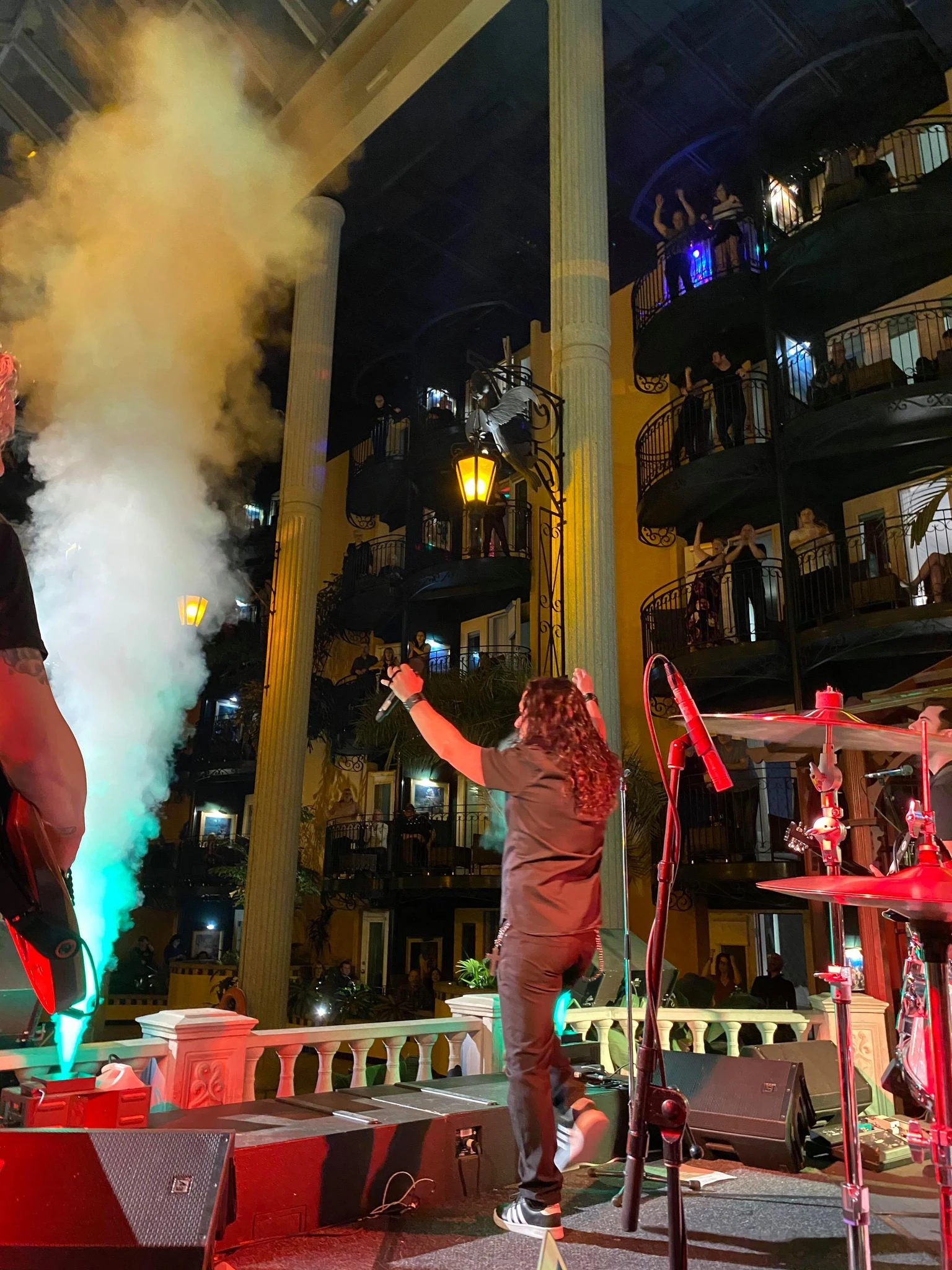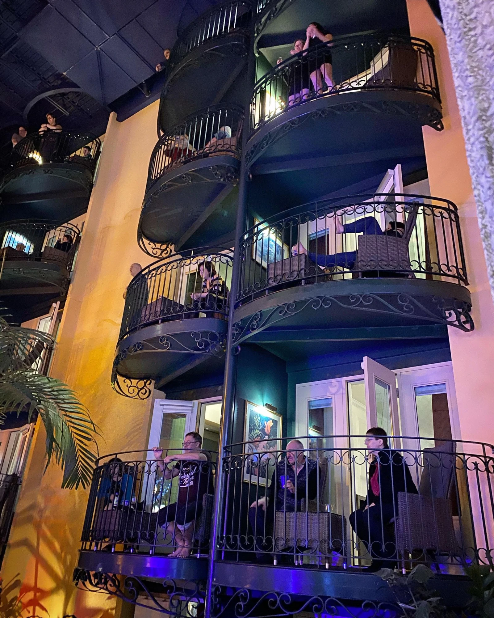 Des spectateurs commencent à apparaître sur leurs balcons. Les règles sont strictes. Avant le début du show, une voix dans l’atrium rappelle d’ailleurs que les rassemblements sont interdits dans les chambres et ailleurs. La survie du concept dépend du respect de ces règles. Une employée a même passé la soirée dans le couloir de mon étage pour s’assurer que chacun reste dans sa chambre.