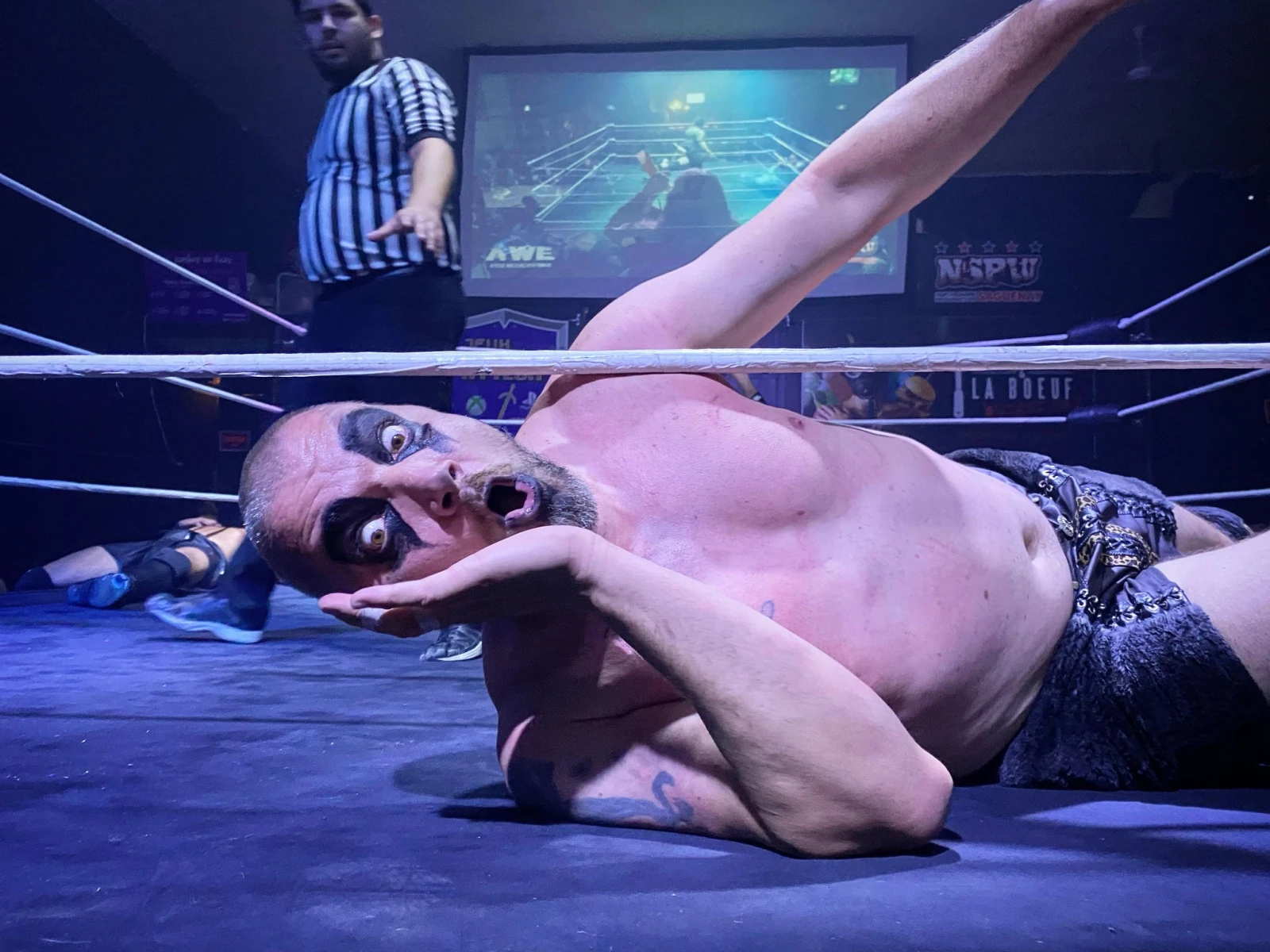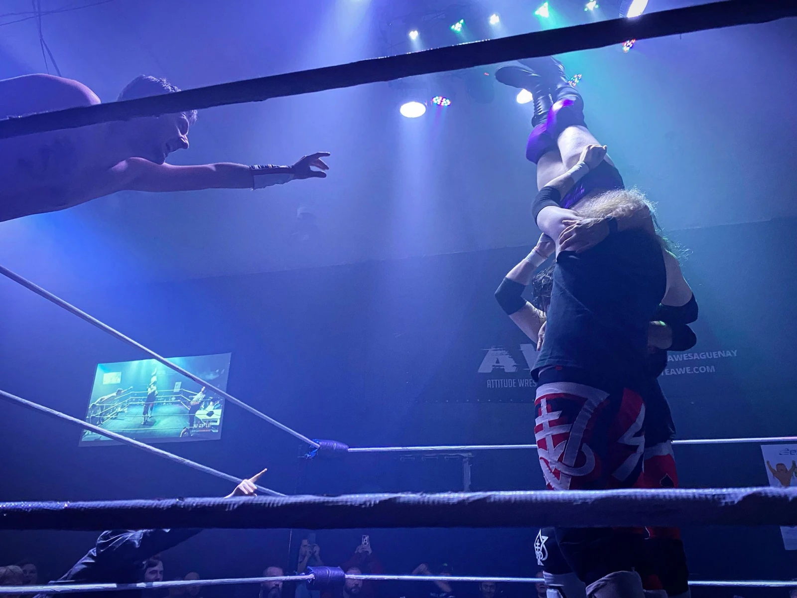L’arbitre grimpe à son tour dans le ring sous les huées, comme il se doit.