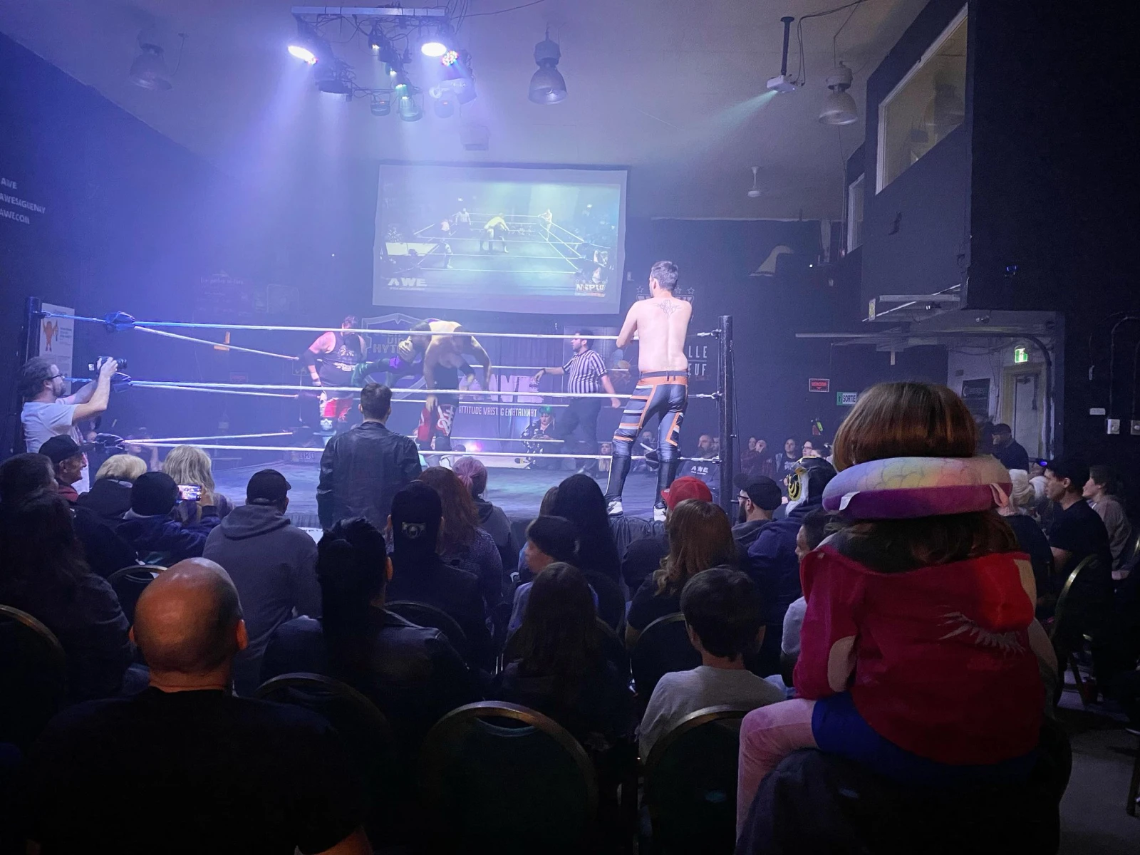 « Lutte professionnelle toutes les semaines », claironne l’écriteau à l’entrée, au sujet du rendez-vous hebdomadaire – ZE happening à Chicout’ les vendredis – organisé par la Attitude Wrestling Entertainment (AWE)