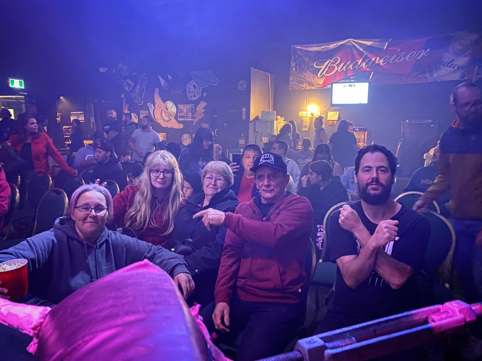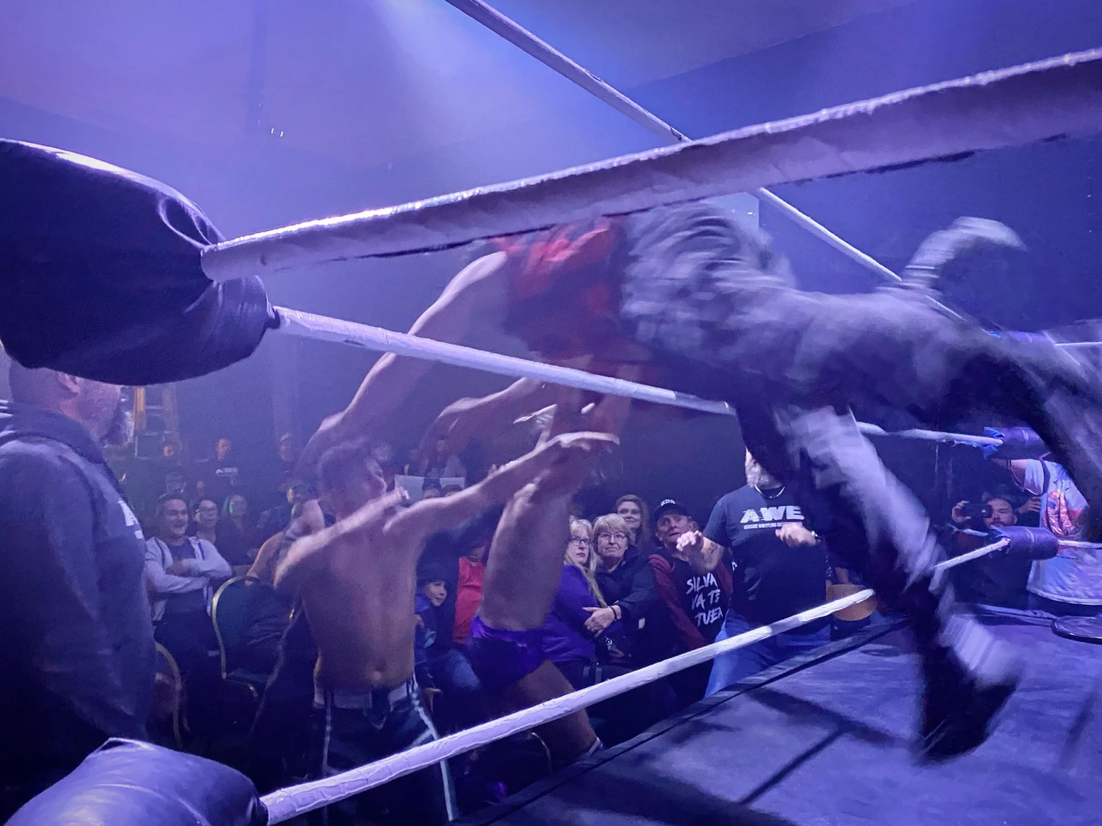 À côté de lui, Mélissa fronce les sourcils. « Heille, arrête de dire ça que t’as une semaine de marde! Moé je travaille TOUTE la semaine dans la marde pour vrai! », le rabroue en riant Mélissa, employée d’une compagnie de fosse septique, aussi inconditionnelle des soirées de l’AWE. « Je ne connais rien à la lutte, mais j’ai vu leur live sur Twitch durant la pandémie et je viens toutes les semaines depuis six mois », mentionne Mélissa, qui retarde même sa fin de semaine de camping pour ça. « Je monte après et j’arrive vers 2h du matin. J’ai déjà le look! », lance-t-elle en riant, en pointant ses Crocs mauves.