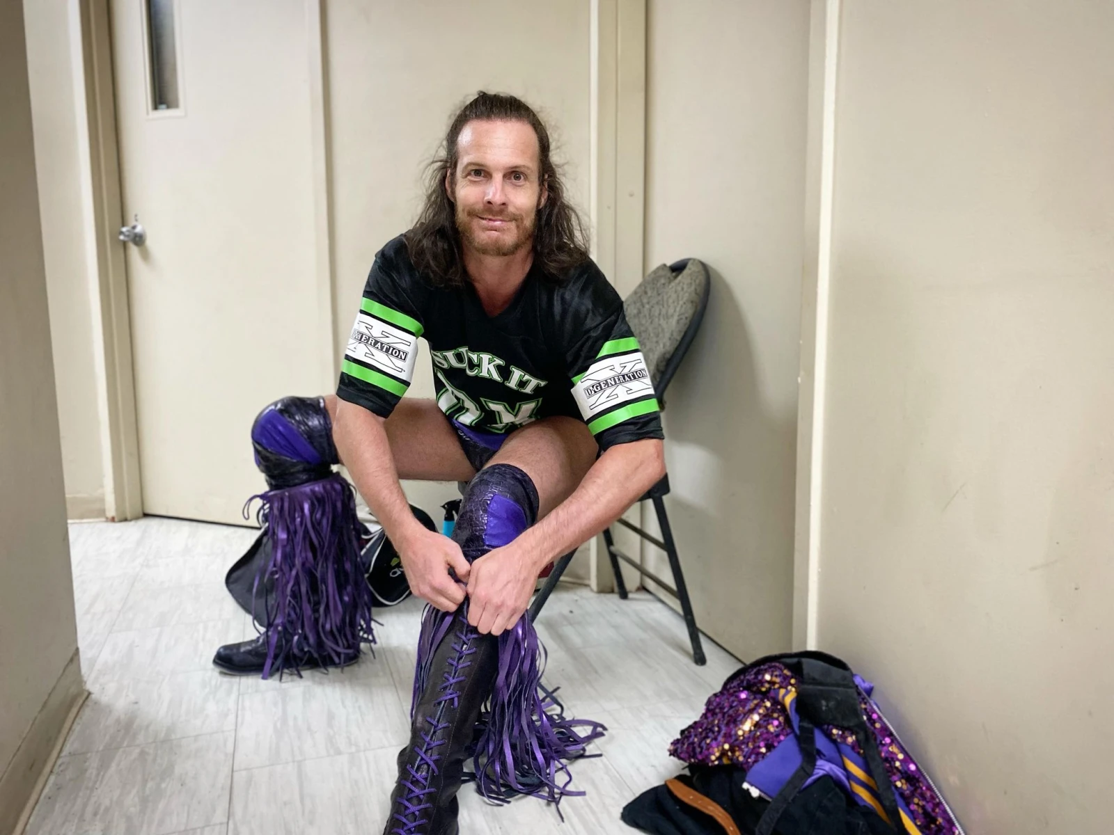 Pendant qu’il enfile ses longues bottes mauves extra franges, Philippe me raconte son parcours. Le vét éran de 39 ans revient de loin. « Ça fait 22 ans que je lutte. J’ai fait une dépression il y a deux ans en voyant que plusieurs lutteurs que j’avais entraînés livraient des combats partout au Québec. J’étais écoeuré, frustré puis tout a crashé », confie Philippe, qui a ensuite sombré dans l’alcool et la drogue.