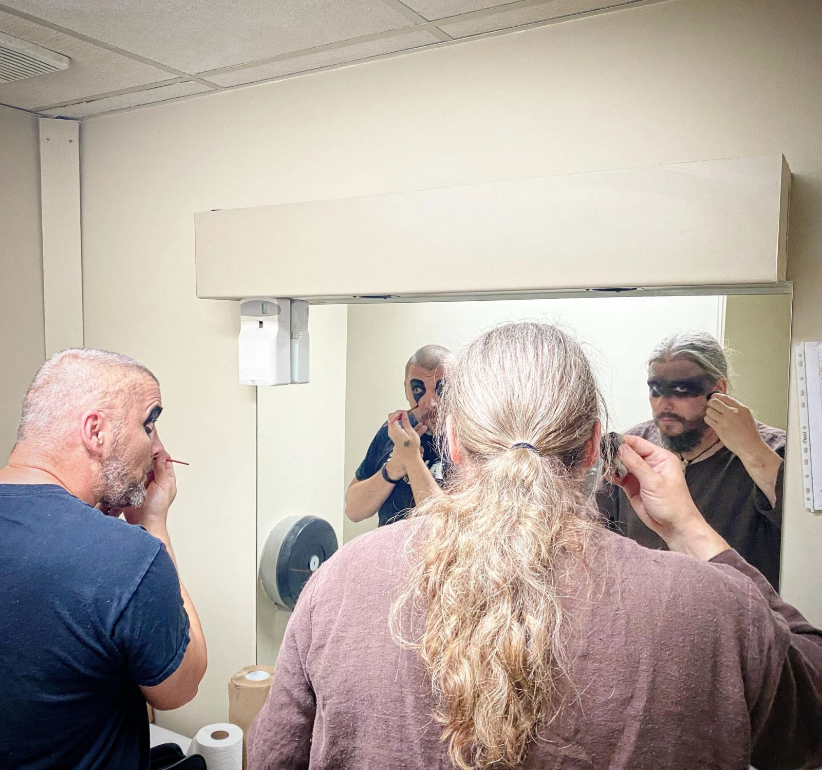 En retournant dans la salle, je croise Skoll l’impitoyable et son acolyte Skogen en train d’appliquer la dernière touche de leur maquillage devant un miroir de salle de bain.