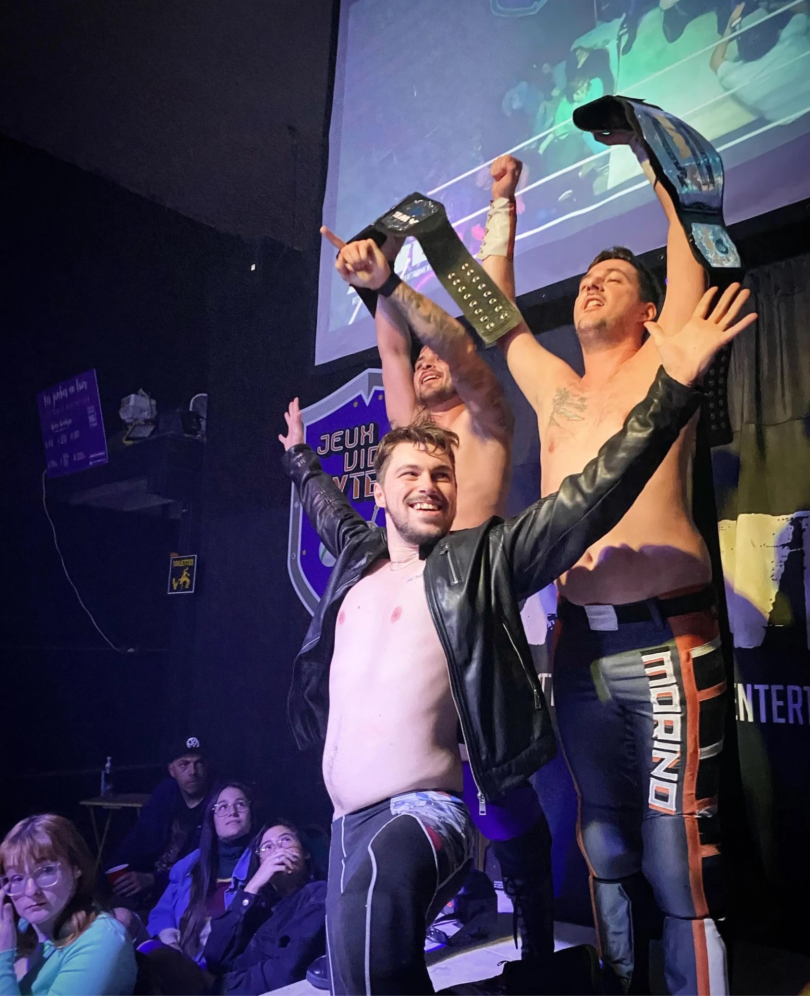 À ces gros noms se greffent quelques chouchous des environs, comme Alexandre Morin AKA Morino, un heel (méchant) que tout le monde déteste avec amour. Si la lutte est fake, la haine envers le jeune homme l’est tout autant, même si elle est pour le moins démonstrative. Parlez-en à tous ces gens dans la file portant le subtil t-shirt sur lequel on peut lire « Va chier Morino ».