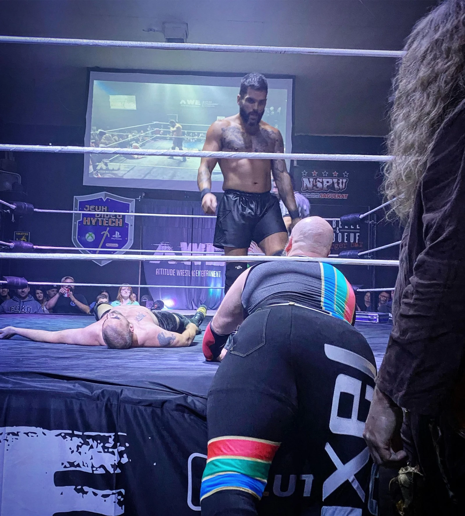 Vraiment du haut calibre, j’ai encore un sourire étampé dans la face juste à y penser. Le combat qui se transporte dans la salle de manière totalement chaotique (et hautement réaliste), les taloches parmi la foule, un enfant qui sacre une violente mornifle à Matt Angel, un autre d’à peine cinq ans qui s’époumone « Tabarnak! Tabarnak! », le tout culminant vers le crissage en règle des méchants Matt Angel et DGenerate au travers des tables en bois.