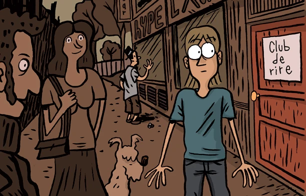 Tous les jeudis de 18 h à 19 h, ce club, ouvert à tous, se réunit au studio Bizz en face du métro Mont-Royal. J’avais déjà grimpé les marches de cet immeuble, mais je m’étais toujours arrêté au deuxième étage, là où se trouve la salle de billard. Je n’avais jamais mis les pieds dans ces «espaces locatifs pour esprits créatifs» situés au troisième. En entrant, j’ai été impressionné. Les propriétaires des lieux ont mis le paquet pour que l’espace ait l’air beau et organisé, et effectivement, ça marche. J’ai enlevé mes bottes, tel que requis par les vingt-sept pancartes demandant d’enlever nos bottes, et j’ai demandé à la gentille madame de l’accueil si c’était bien ici, le Club de Rire. Elle m’a dit « salle A ». J’ai dit « merci ».