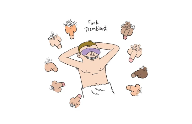Choc numéro un : les pénis! Partout! Des affiches de messieurs tout nus grandeur nature, des films pornos sur écran géant, des sculptures et, bien sûr, d’authentiques pénis, très réels, fixés sur des messieurs tout aussi réels, circulant autour de moi comme des vautours. J’étais vraiment au temple de la bite. Évidemment, la plupart de ces bites pointaient bien haut vers le ciel et, gorgées de sang, me regardaient comme des cobras sur le point d’attaquer.