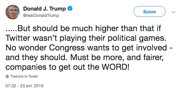 Ils seraient aussi plus enclins à voter à gauche, caractéristique que le Président américain dénonce régulièrement dans ses tweets en accusant le réseau social de jouer une «game politique» et d’être en faveur des démocrates.