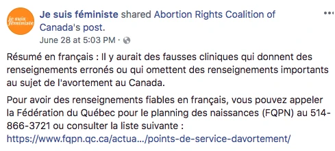 Il y a quelques semaines, Je suis féministe a partagé sur sa page Facebook une publication de Abortion Rights coalition of Canada qui sonnait l’alarme sur des cliniques qui partagent des informations erronées sur l’avortement.