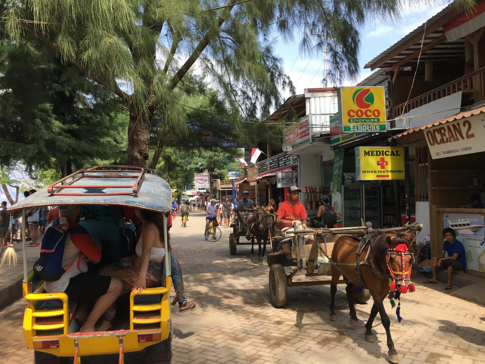 Au fait, Gili signifie «île» en Indon ésien et l’archipel se déploie entre trois Gili voisines : Trawangan, Meno et Air. En plus d’être magnifiques, ces îles ont la particularité d’interdire les moteurs, ce qui nous donne un sacré répit après des mois à essayer de survivre en traversant les rues asiatiques.