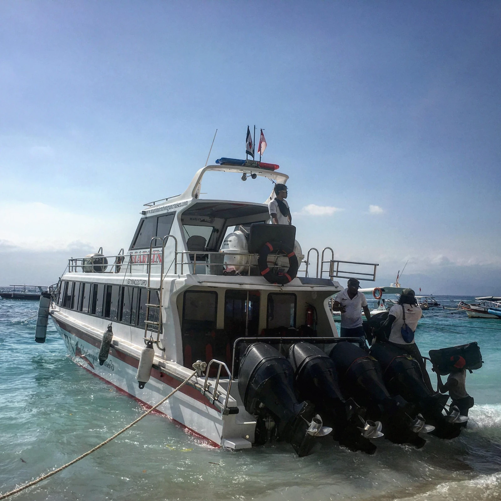 Martine, Simone et moi avons opté pour le lent ferry, puisque la petite vomit souvent dans les transports. Elle m’avait fait le coup en allant à Nusa Lembongan deux jours avant, en gerbant l’équivalent de son poids sur mes pantalons beiges et la banquette en cuirette. On a adoré l’option relaxe. La petite s’amusait dans un module sur le pont et des dauphins sautillaient dans l’eau de chaque côté du bateau.