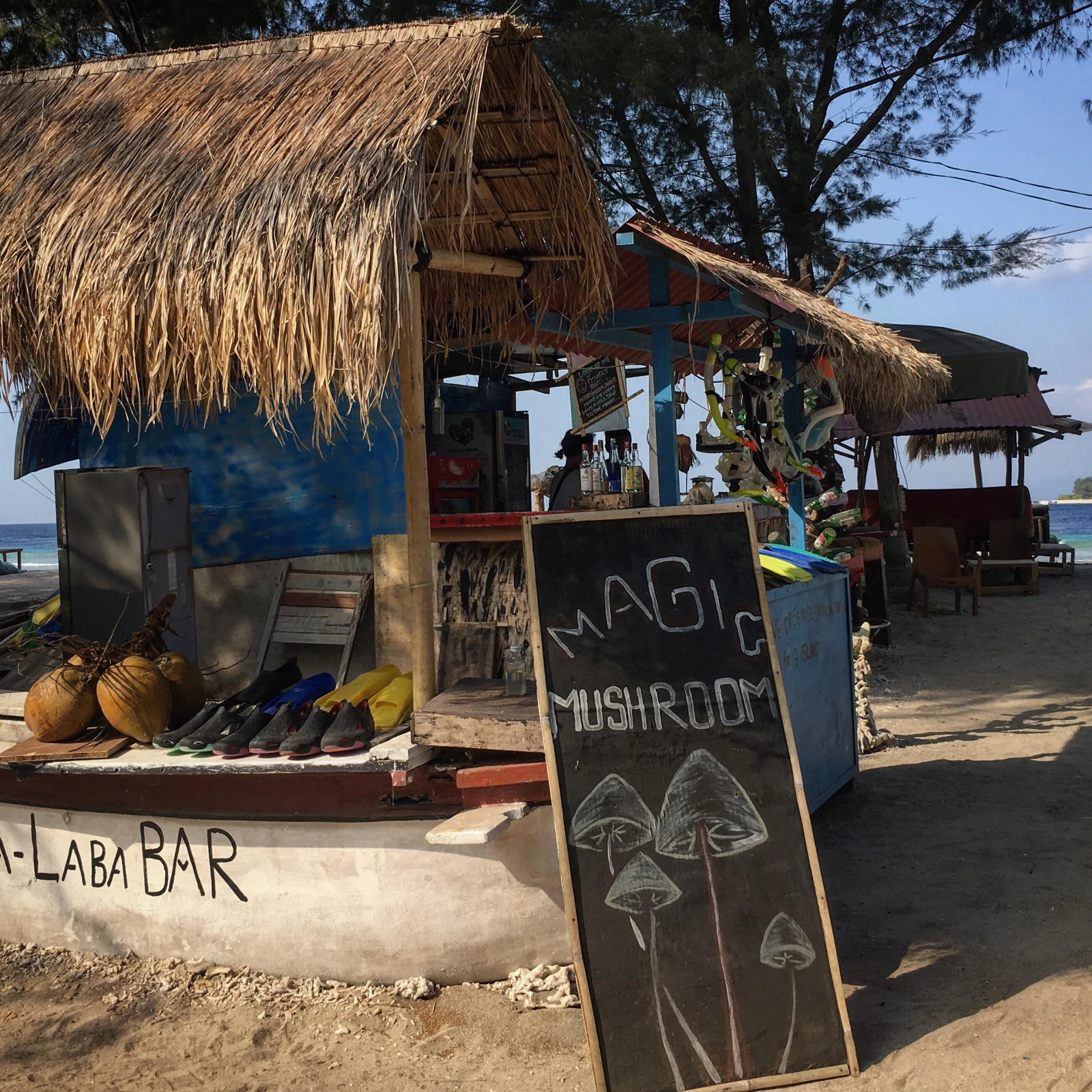 Sur les menus, plusieurs bars font la promotion des smoothies au mush, classique underground des îles Gili. Plusieurs graffitis et écriteaux éparpillés sur l’île y font référence et laissent donc deviner une forme de tolérance envers le nectar aux vertus hallucinogènes.
