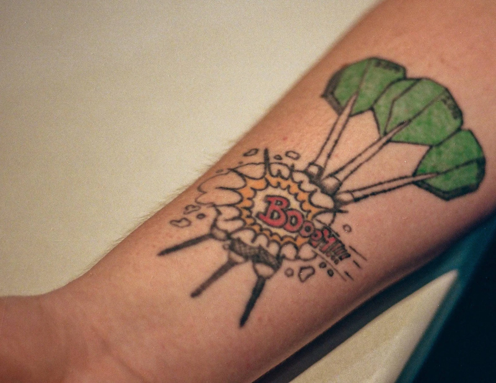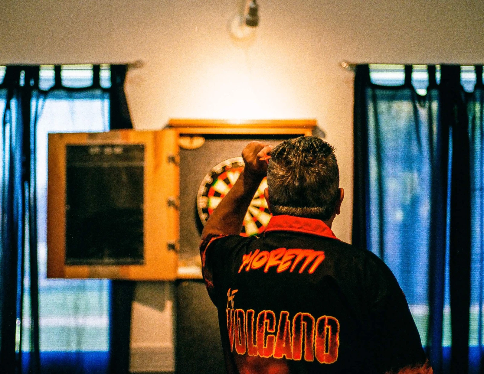 Stéphane, l’une des vedettes du circuit, s’ouvre sur l’une de ses superstitions. Depuis des années, il s’engage toujours dans le même ordre de couleur. Noir, bleu, rouge. Les joueurs m’exhibent leurs outils de travail, me parlent avec fougue de leur plume. Pourquoi ils préfèrent des 21 grammes aux 27. « Plus tu tires fort, plus ça doit être lourd », explique Nicolas. La technique de lance, la prise en main. On m’introduit au nine-darter, une partie parfaite. On me pointe au passage une ton, un big fish, 126 et dans l’bull pour finir la game. J’écoute la musique des dards.