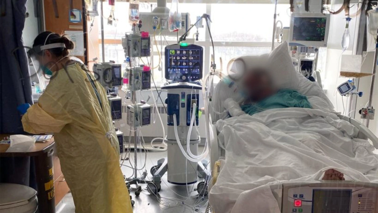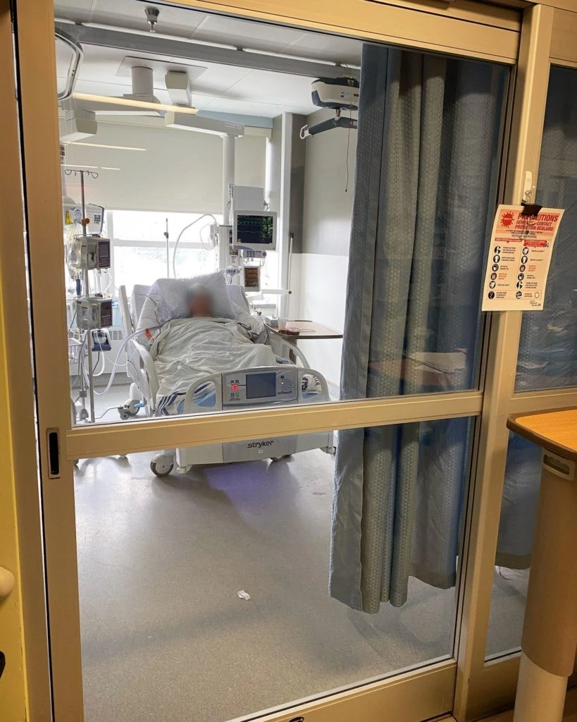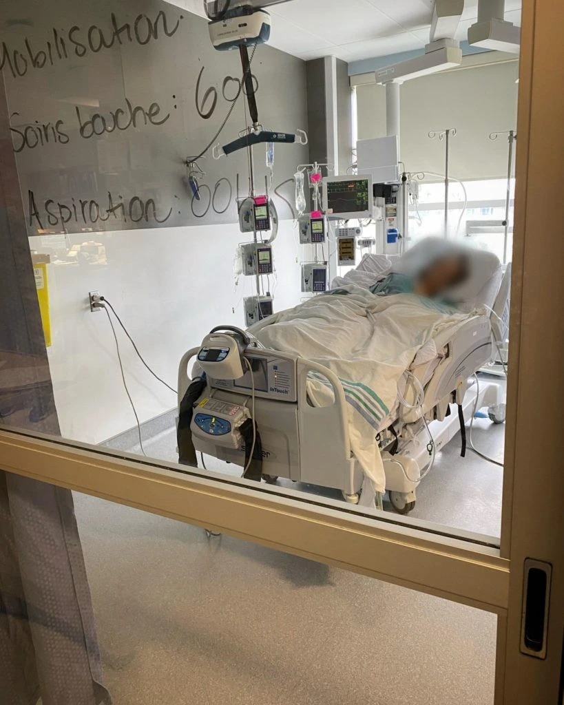 L’unité des soins intensifs est une fourmilière, où les infirmier.ère.s et médecins grouillent dans tous les sens. Il y a un couloir central, autour duquel des patient.e.s – inconscients pour la plupart – sont intubés dans des chambres vitrées. « Toutes nos chambres sont à pression négative», ça veut dire que l’air est envoyé à l’extérieur et non l’inverse », explique l’infirmier en chef, devant la chambre d’un patient âgé dans la soixantaine. « Il ne voulait pas être intubé au début, mais il était à bout de souffle et il a accepté », raconte Sylvain Desrochers, devant le principal intéressé endormi.